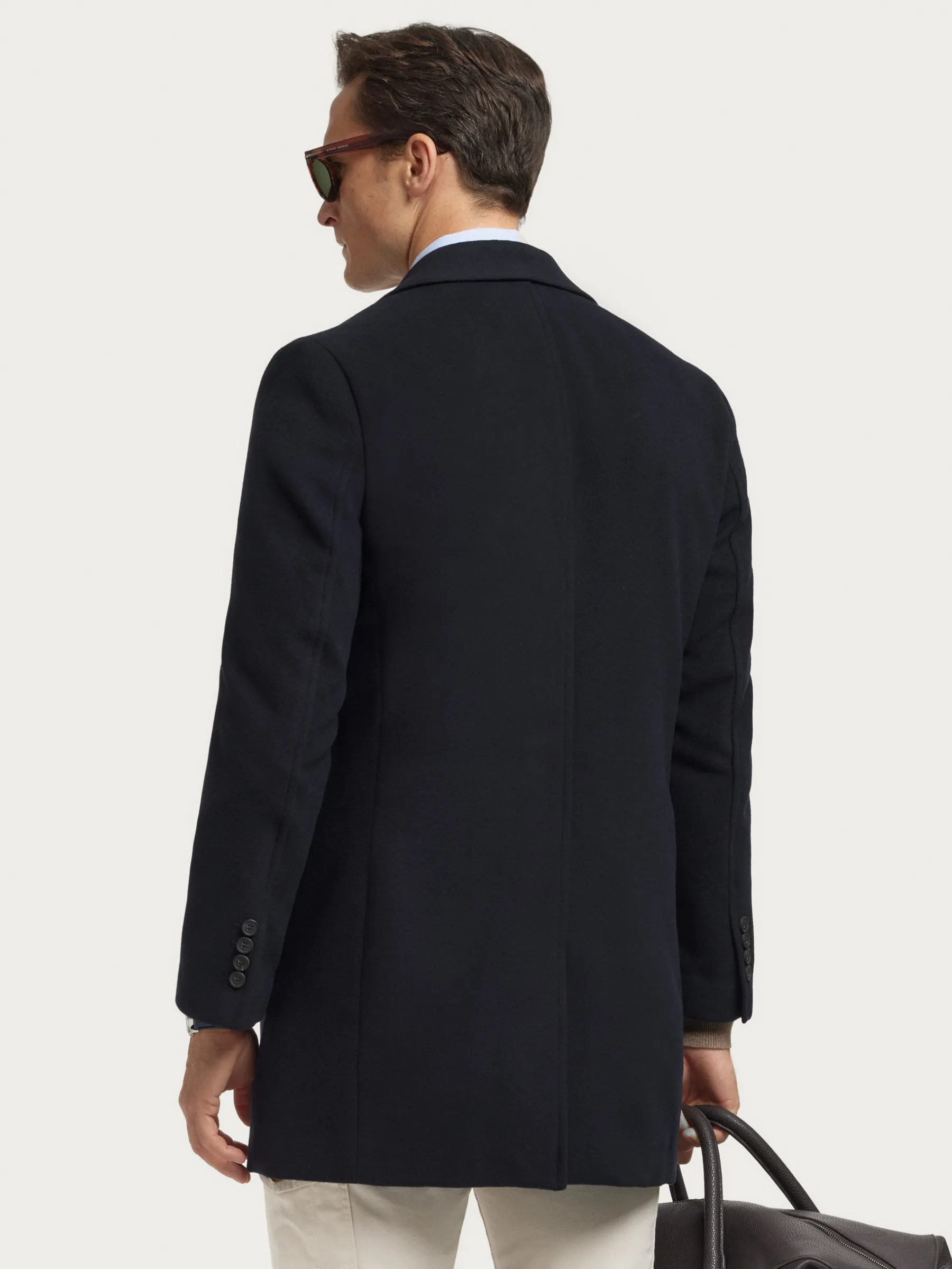 Abrigo de paño liso con cuello y solapa. Cierre central mediante botones, manga larga con botones en su terminación y dos bolsillos a la altura de la cintura. Abertura central en el bajo de la espalda. Corte regular fit.