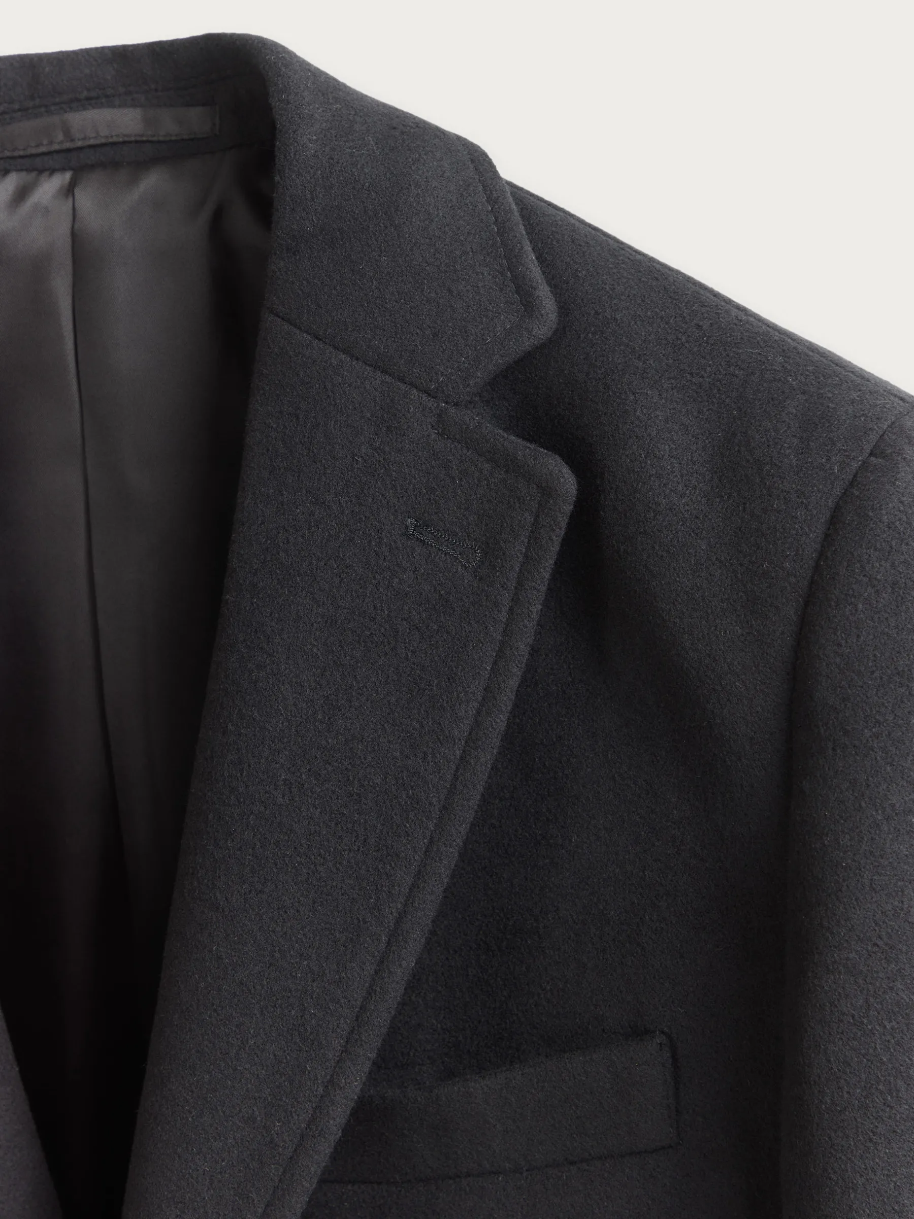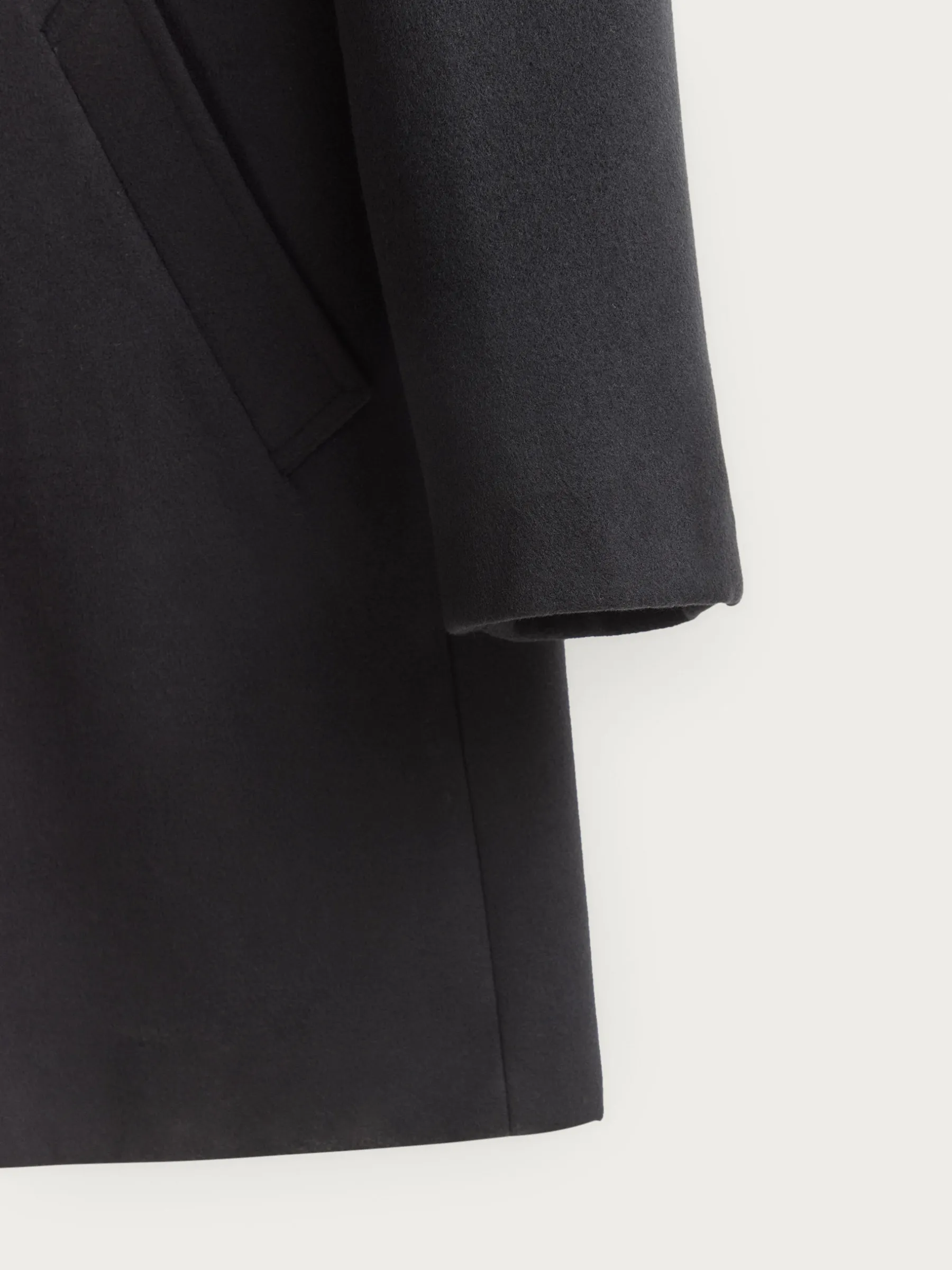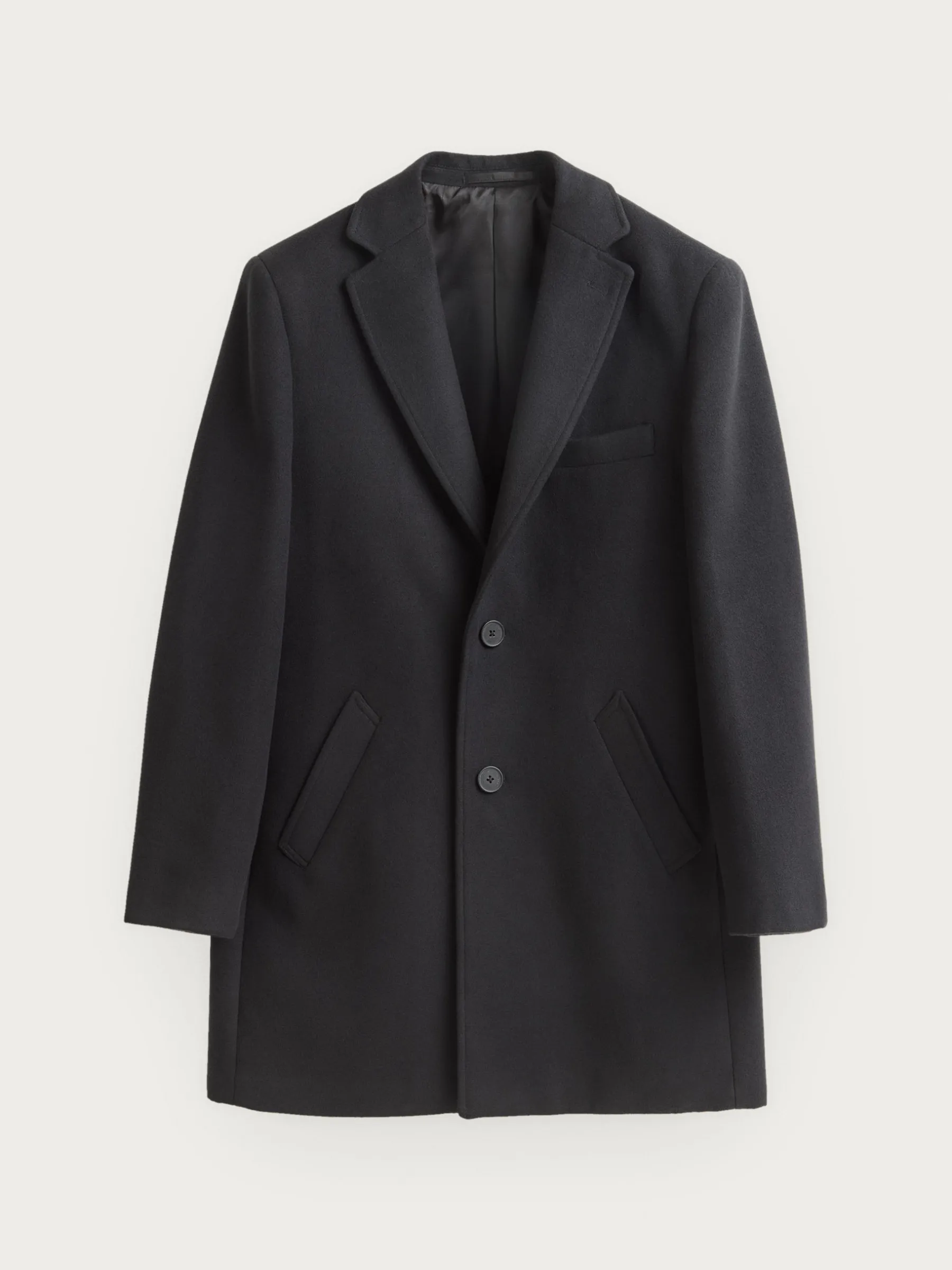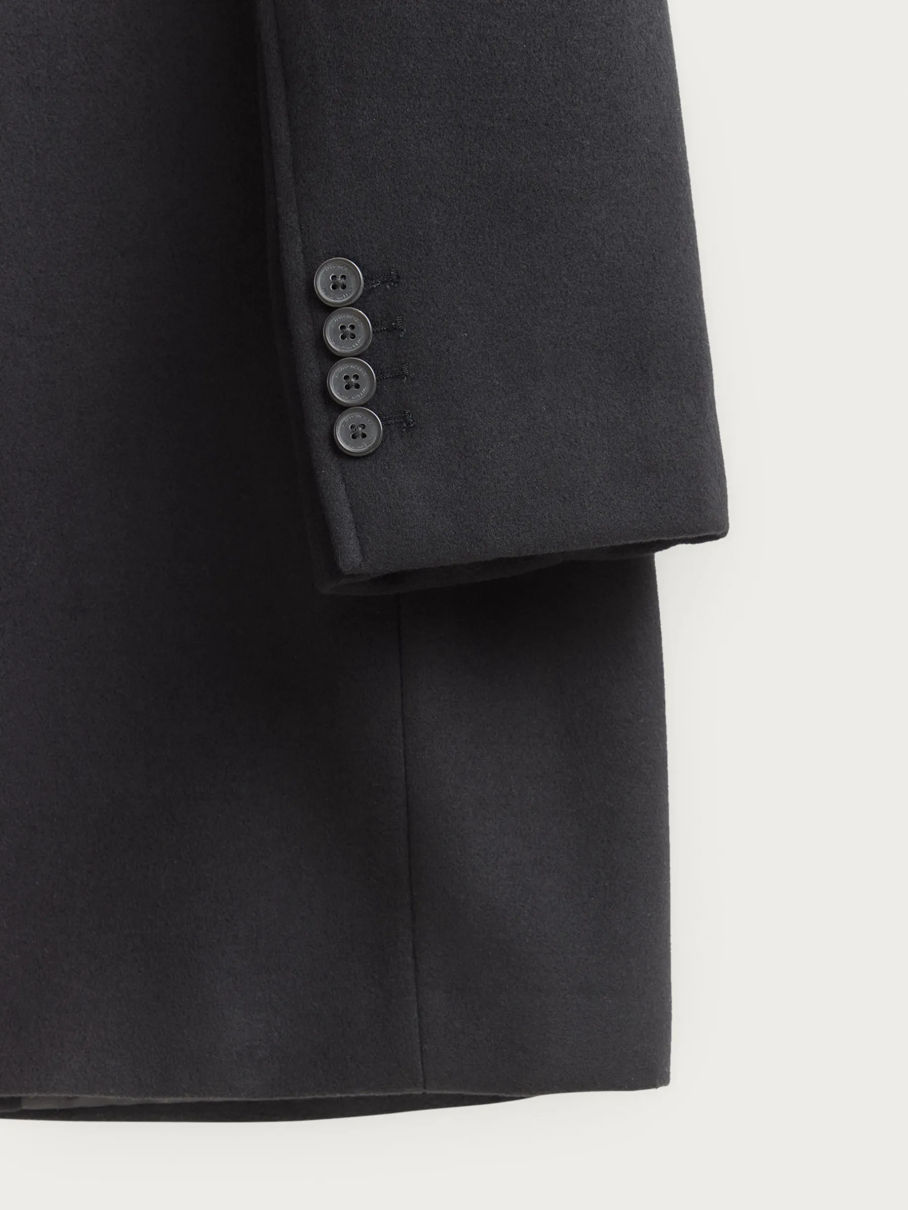 Abrigo de paño liso con cuello y solapa. Cierre central mediante botones, manga larga con botones en su terminación y dos bolsillos a la altura de la cintura. Abertura central en el bajo de la espalda. Corte regular fit.