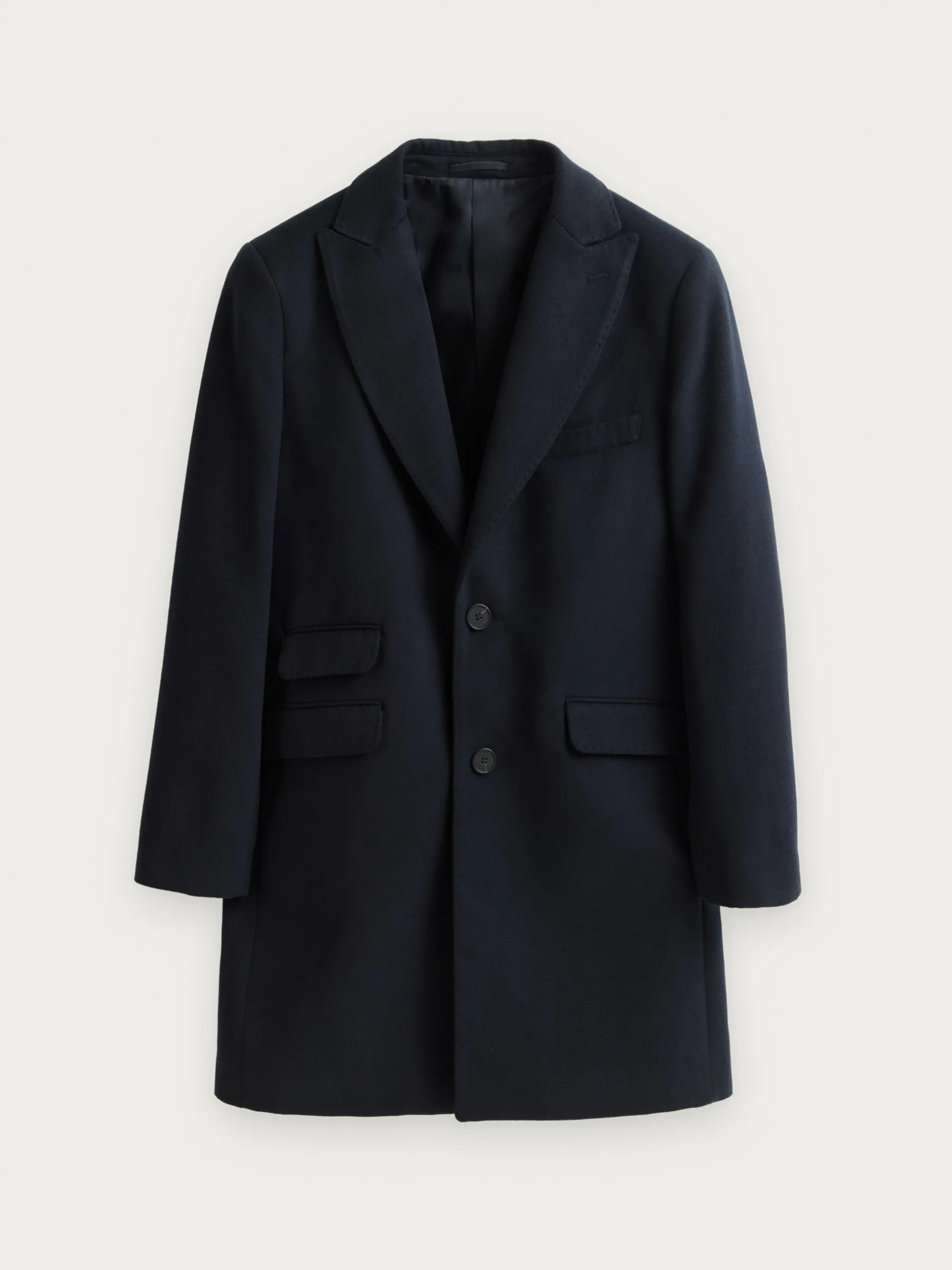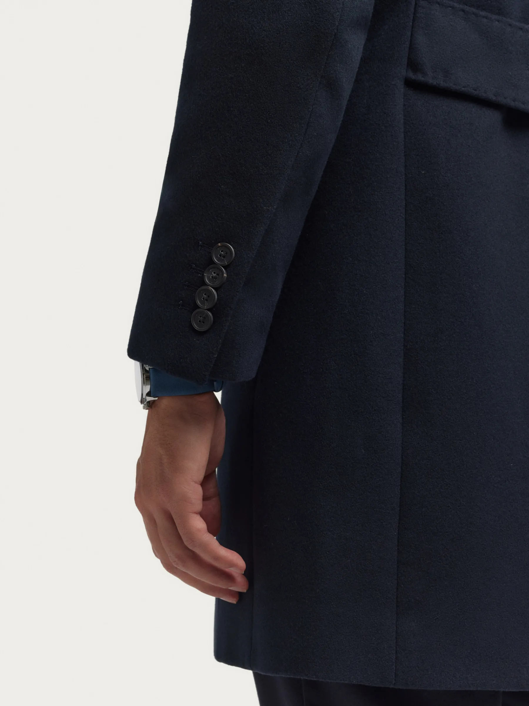 Abrigo con cuello y solapa, cierre central simple mediante dos botones y ajuste martingala en la cintura-espalda. Bolsillo en el pecho y tres bolsillos de solapa en la cintura. Manga con terminación de botones decorativos. Abertura en el bajo. Forrado en su interior con dos bolsillos.