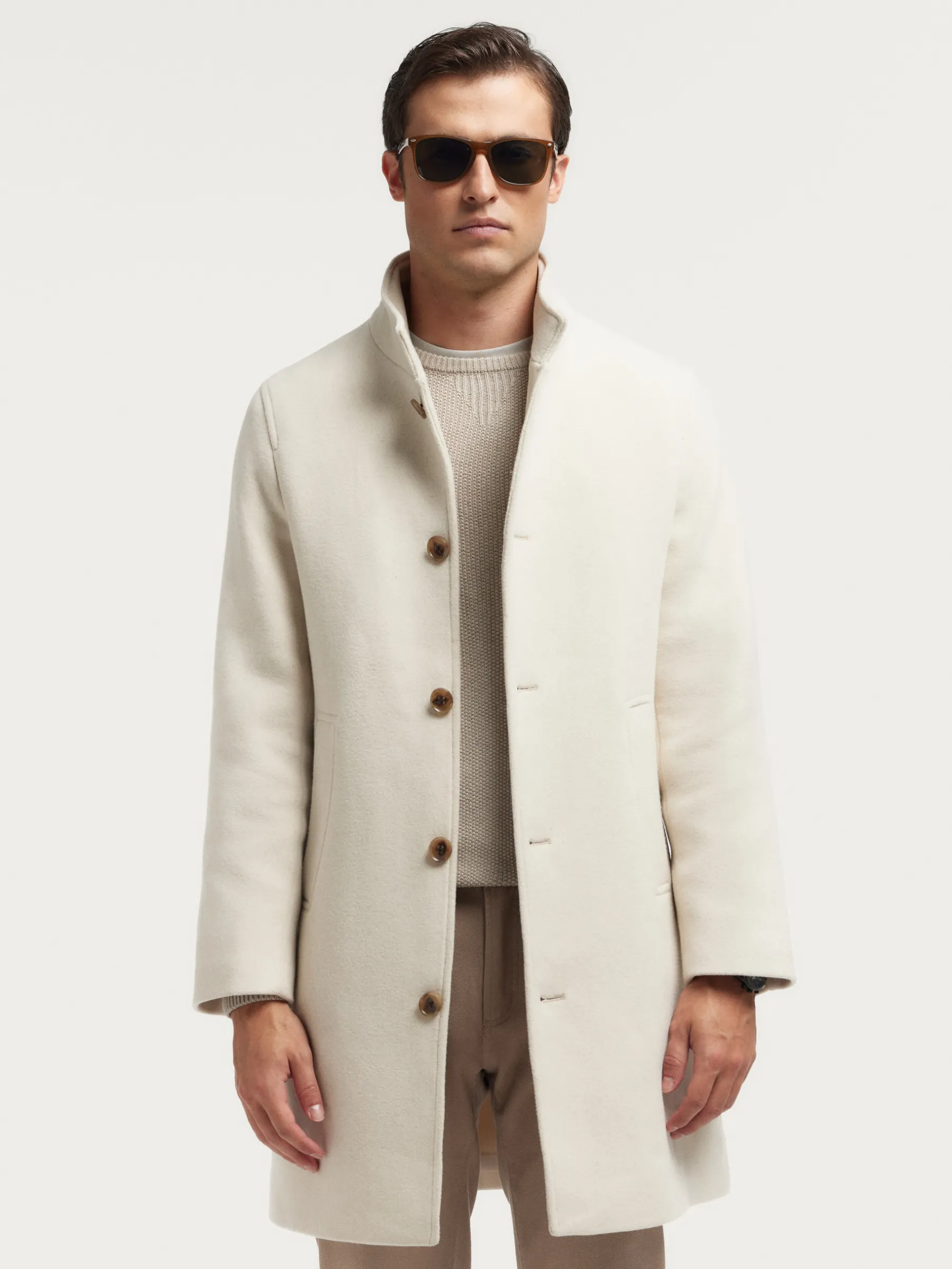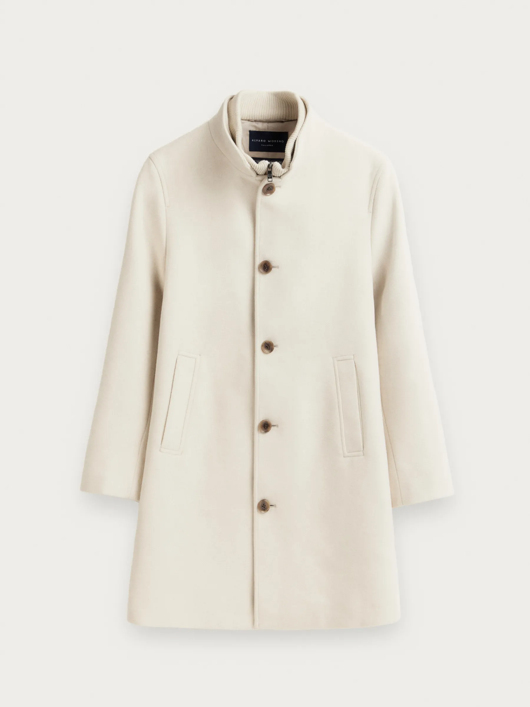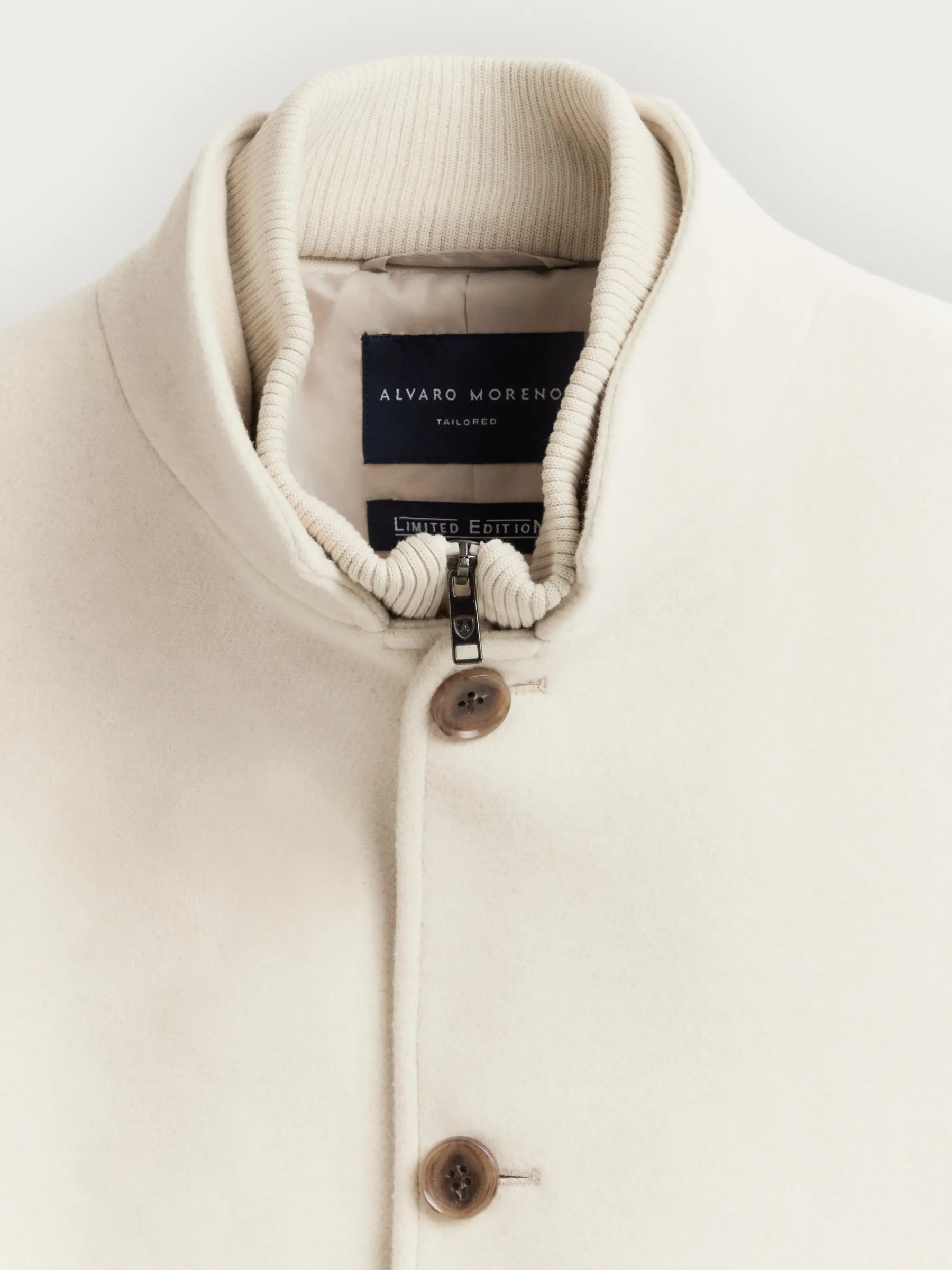 Abrigo con chalequillo interior de cuello subido y desmontable mediante cremallera. Cuenta con cuello y solapa, cierre central simple mediante botonadura efecto madera, cierre del chalequillo por cremallera y abertura en el bajo de la espalda. Dos bolsillos en la cintura y dos bolsillos en su interior. Corte regular fit.