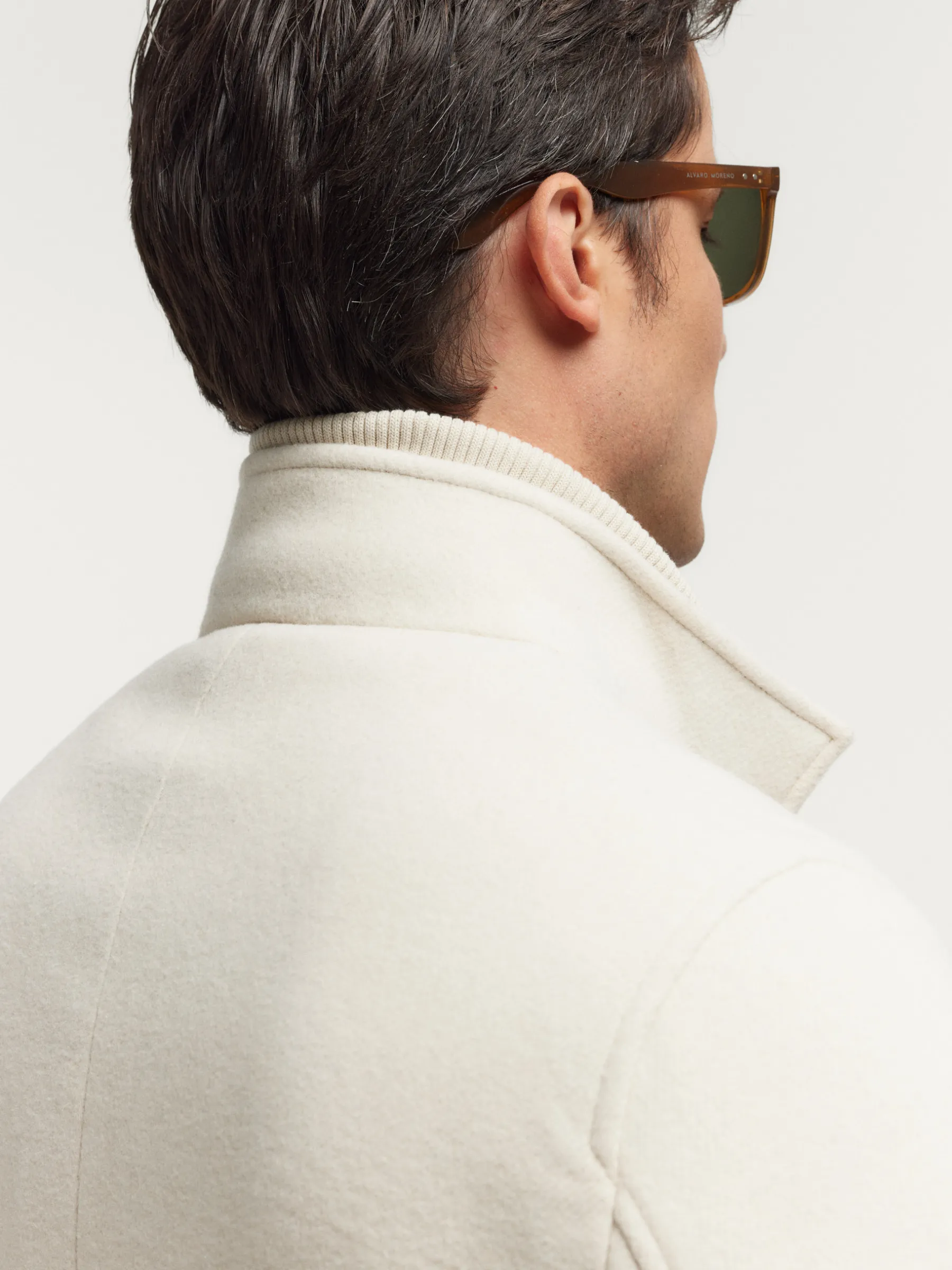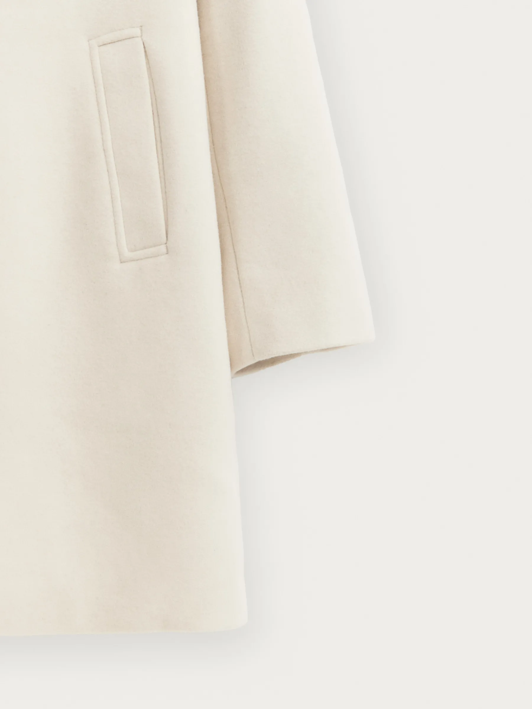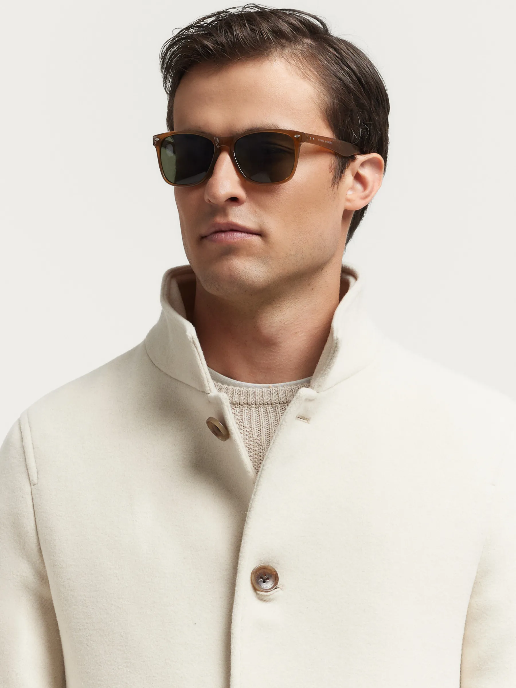 Abrigo con chalequillo interior de cuello subido y desmontable mediante cremallera. Cuenta con cuello y solapa, cierre central simple mediante botonadura efecto madera, cierre del chalequillo por cremallera y abertura en el bajo de la espalda. Dos bolsillos en la cintura y dos bolsillos en su interior. Corte regular fit.