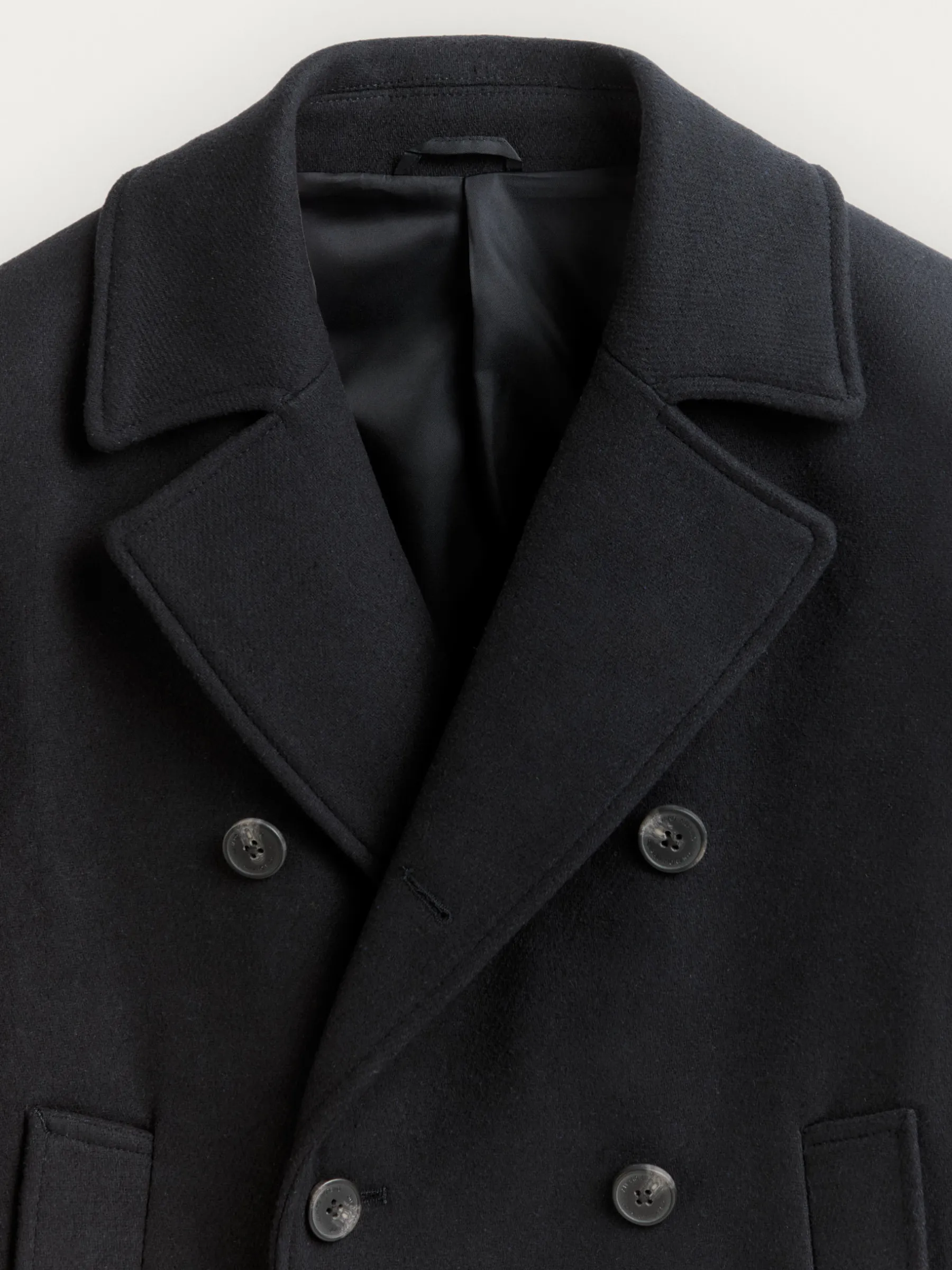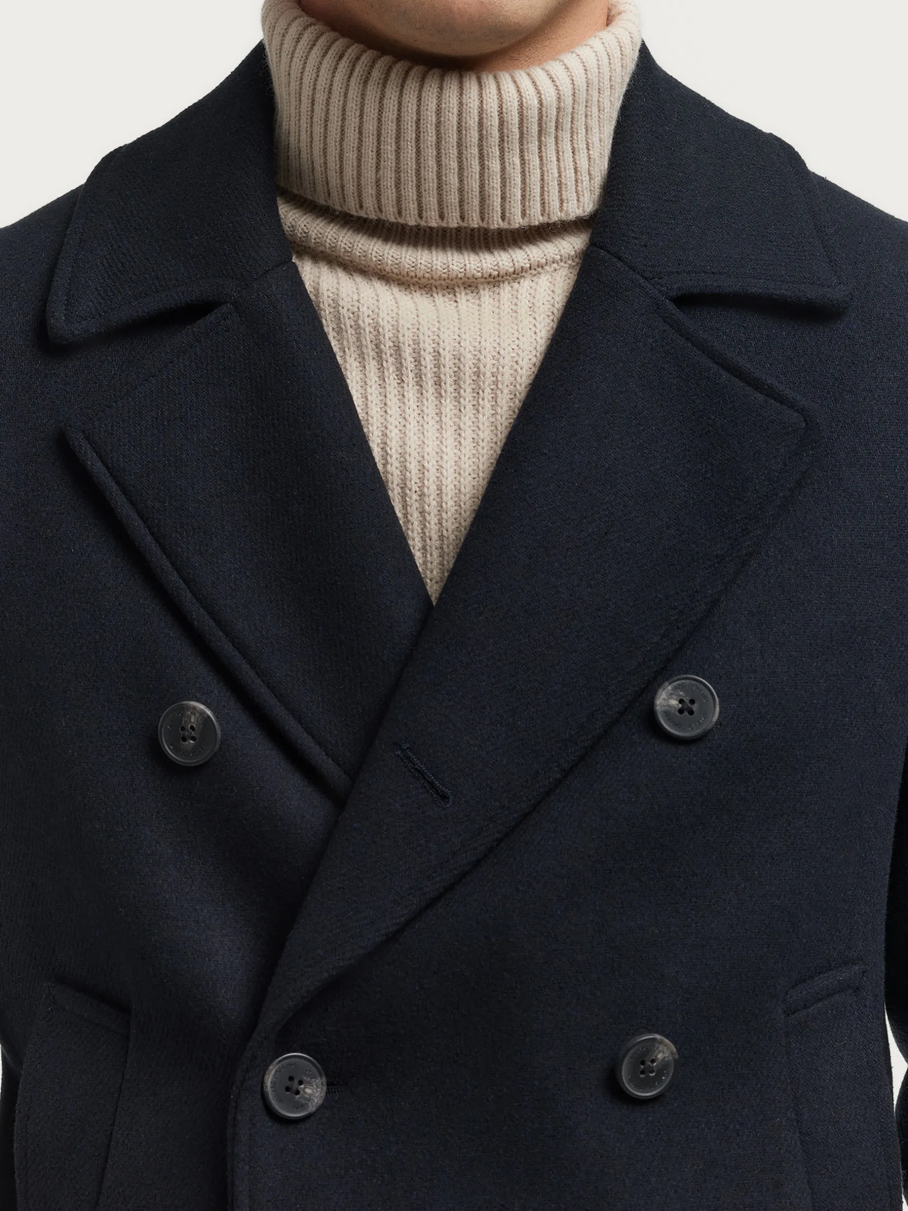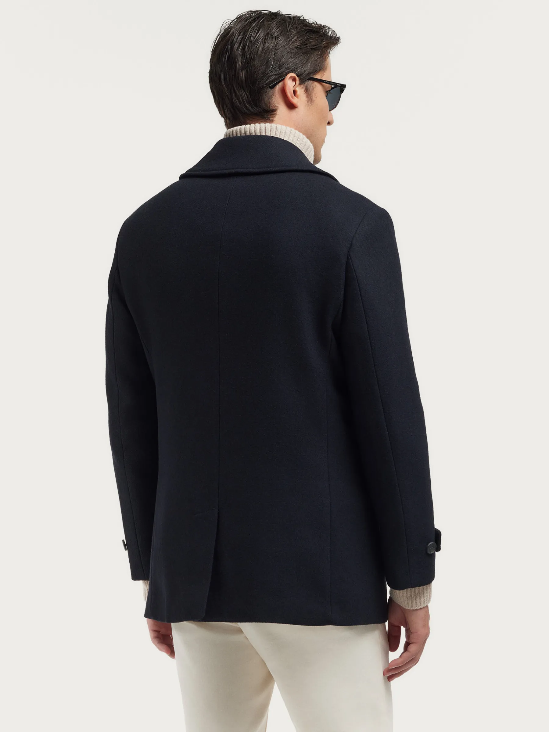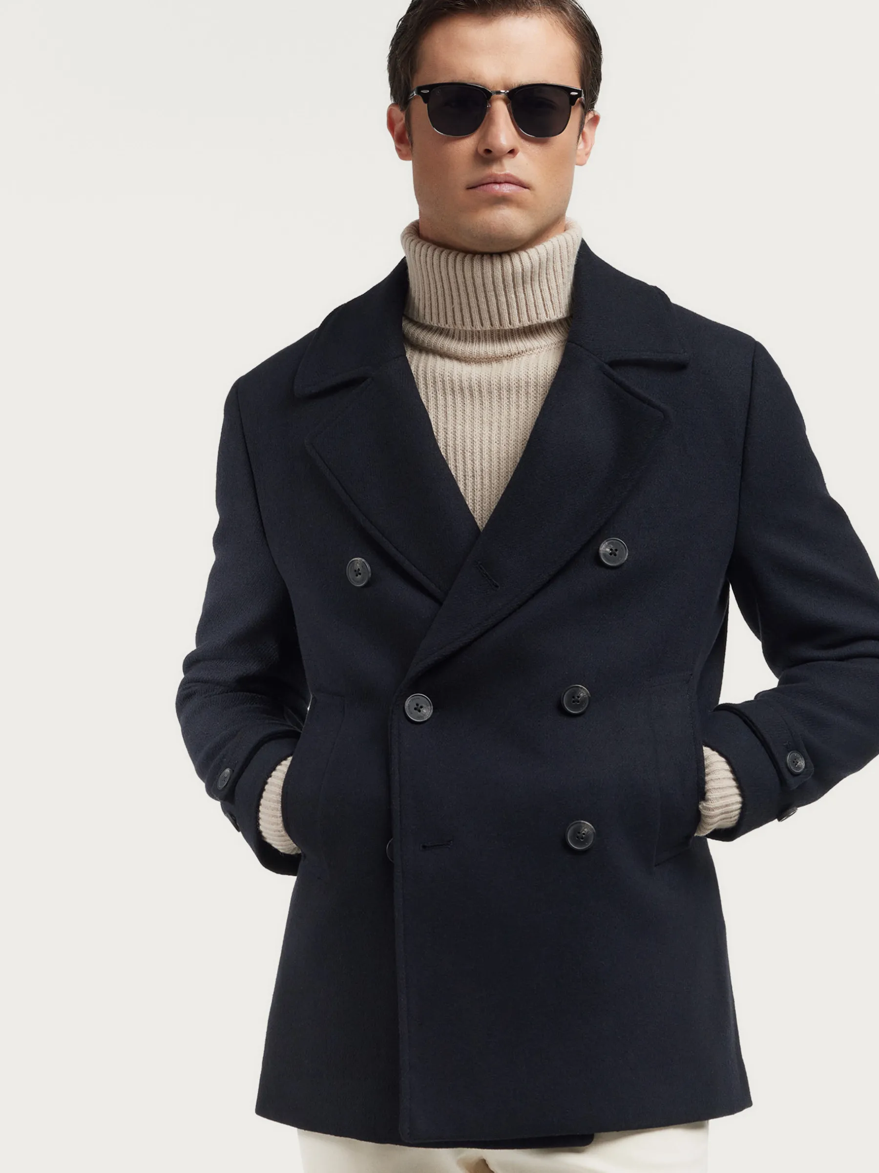 Abrigo de corte regular fit confeccionado en diferentes materiales de los cuales destaca la lana. Cuenta con cuello y solapa, cierre central cruzado, dos bolsillos en la cintura, abertura en el bajo de la espalda y detalle con dos botones en el puño de las mangas. Forrado en su interior con dos bolsillos.