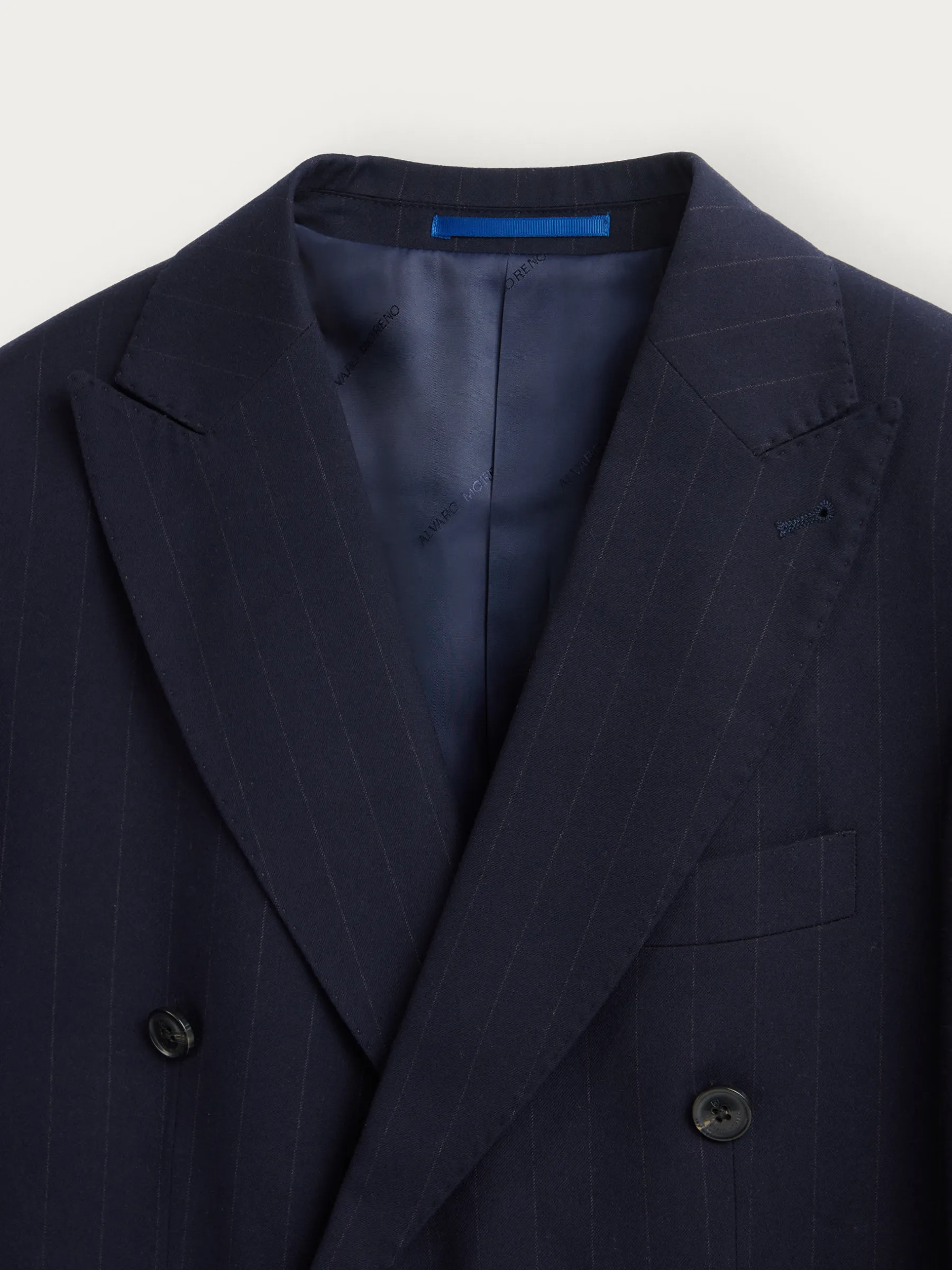 Americana de estilo a rayas con cuello y solapa ligeramente más anchos. Cierre central cruzado, bolsillo en el pecho, tres bolsillos de solapa en la cintura y puños con botones decorativos. Interior forrado y con bolsillos.