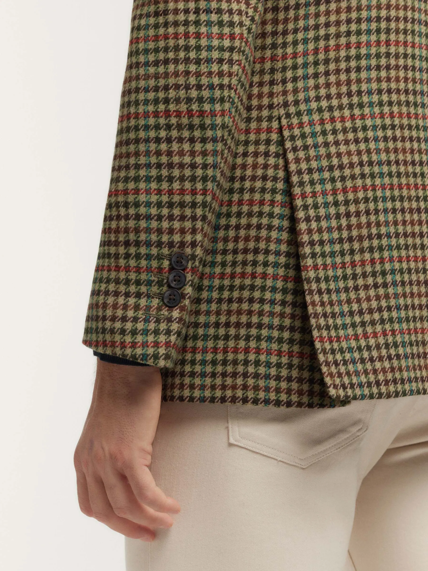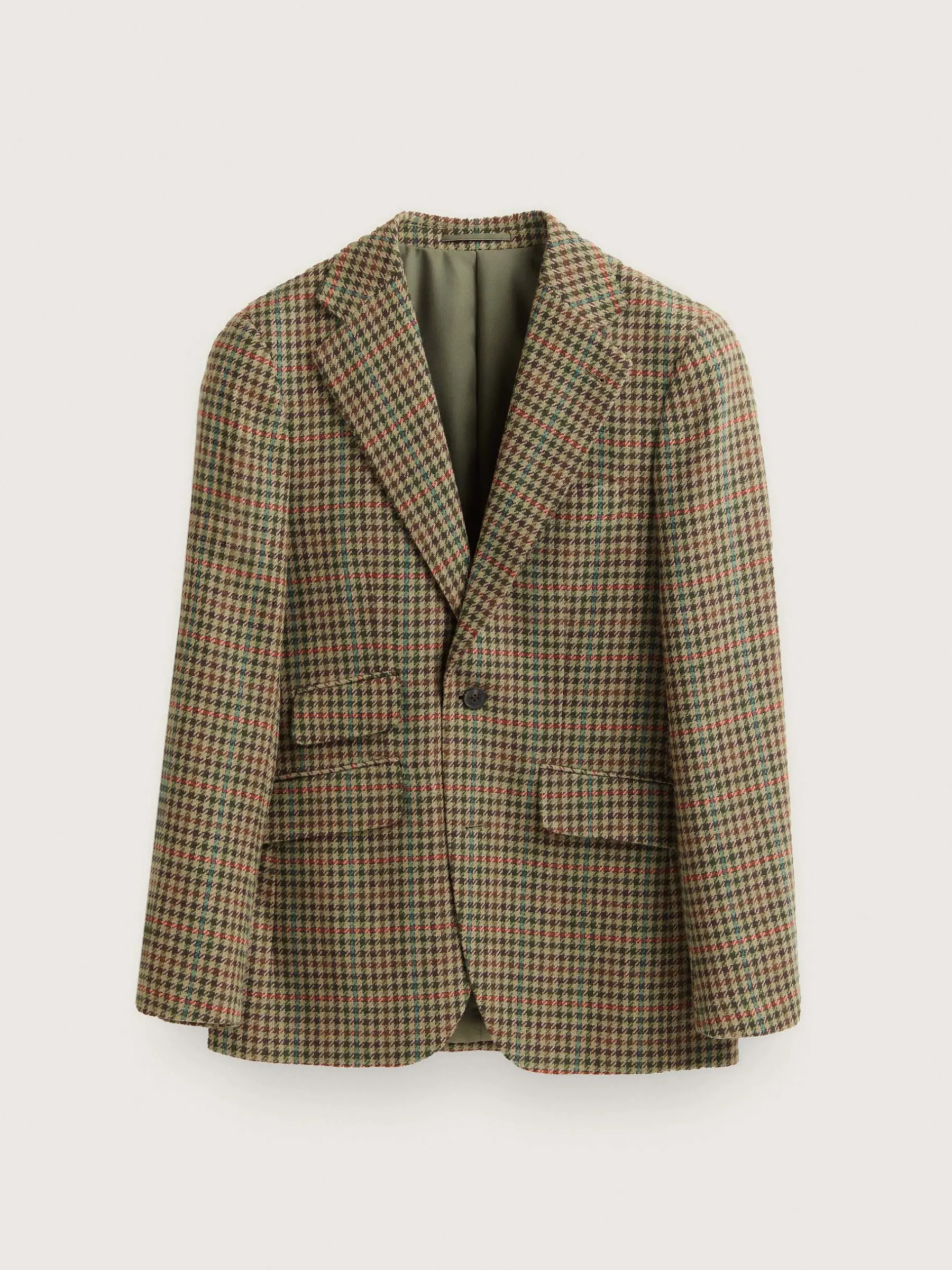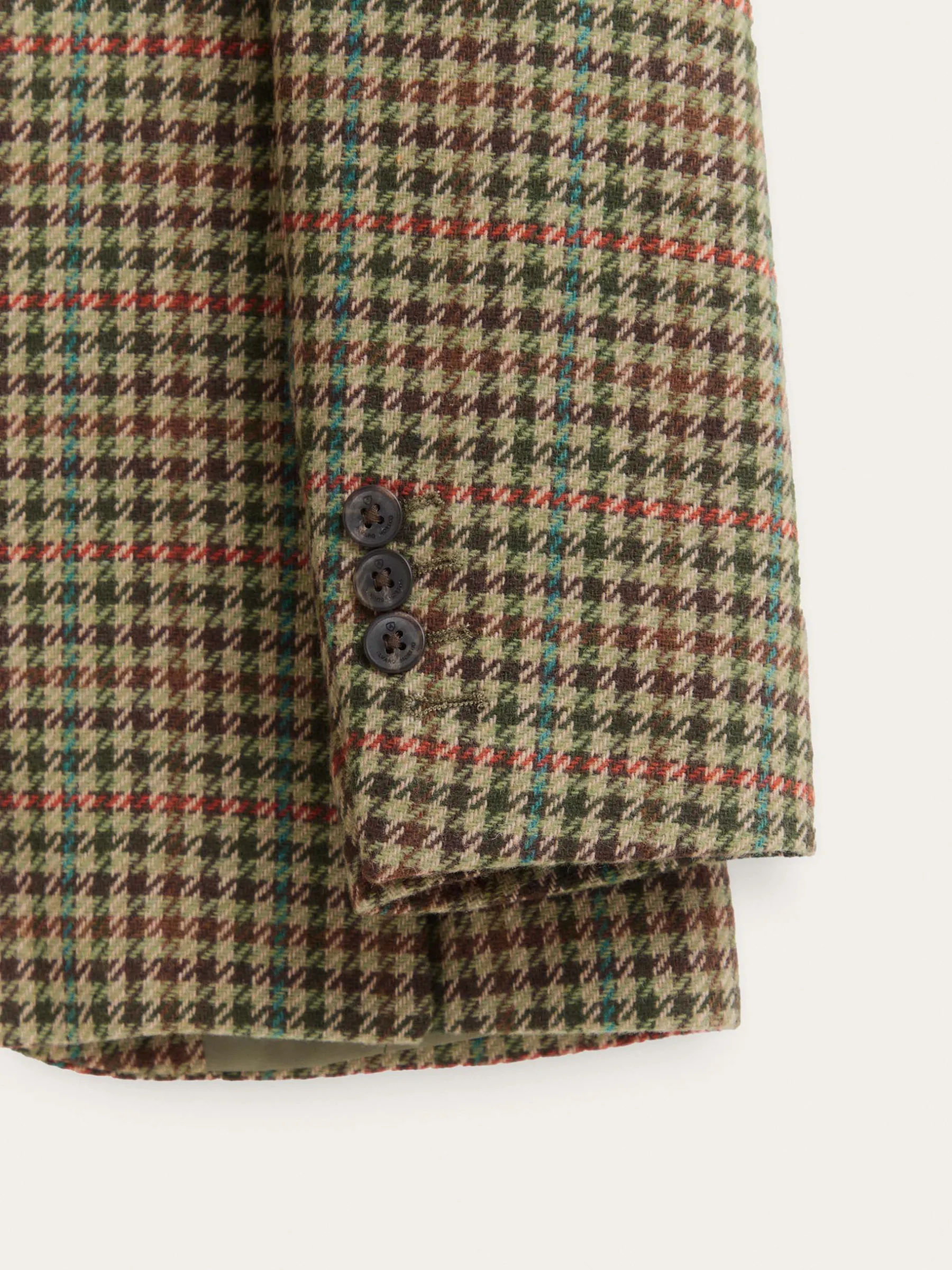 Americana confeccionada en tejido a cuadros de corte slim fit. Cuenta con cuello y solapa, cierre central simple mediante dos botones y puños con botones decorativos. Pinzas en el frontal, tres bolsillos de solapa en la cintura y un bolsillo a la altura del pecho. Interior forrado con dos bolsillos.
