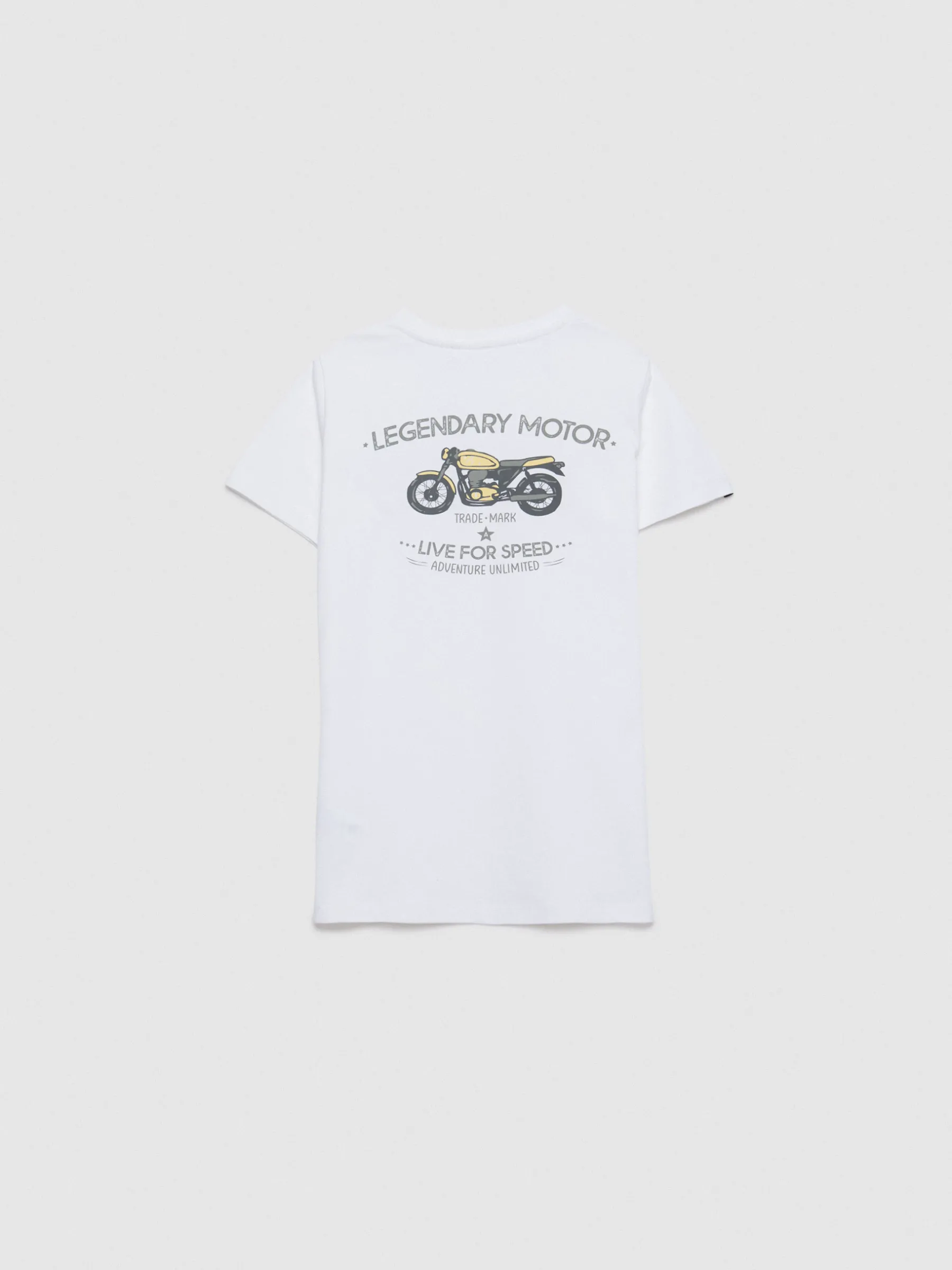 Camiseta con estampado personalizado en la parte trasera y en el frontal a la altura del pecho. Cuenta con cuello redondo y manga corta. Corte regular fit.
