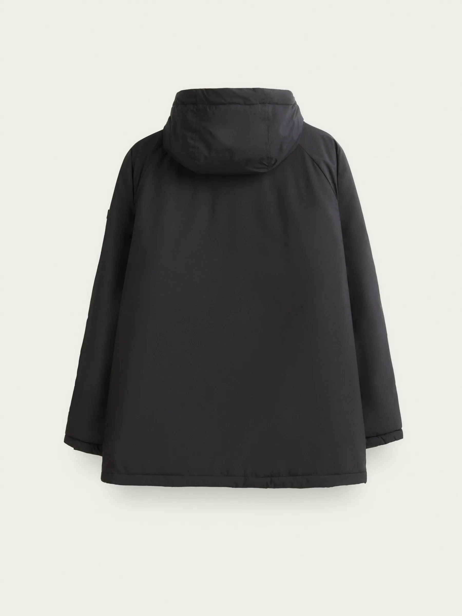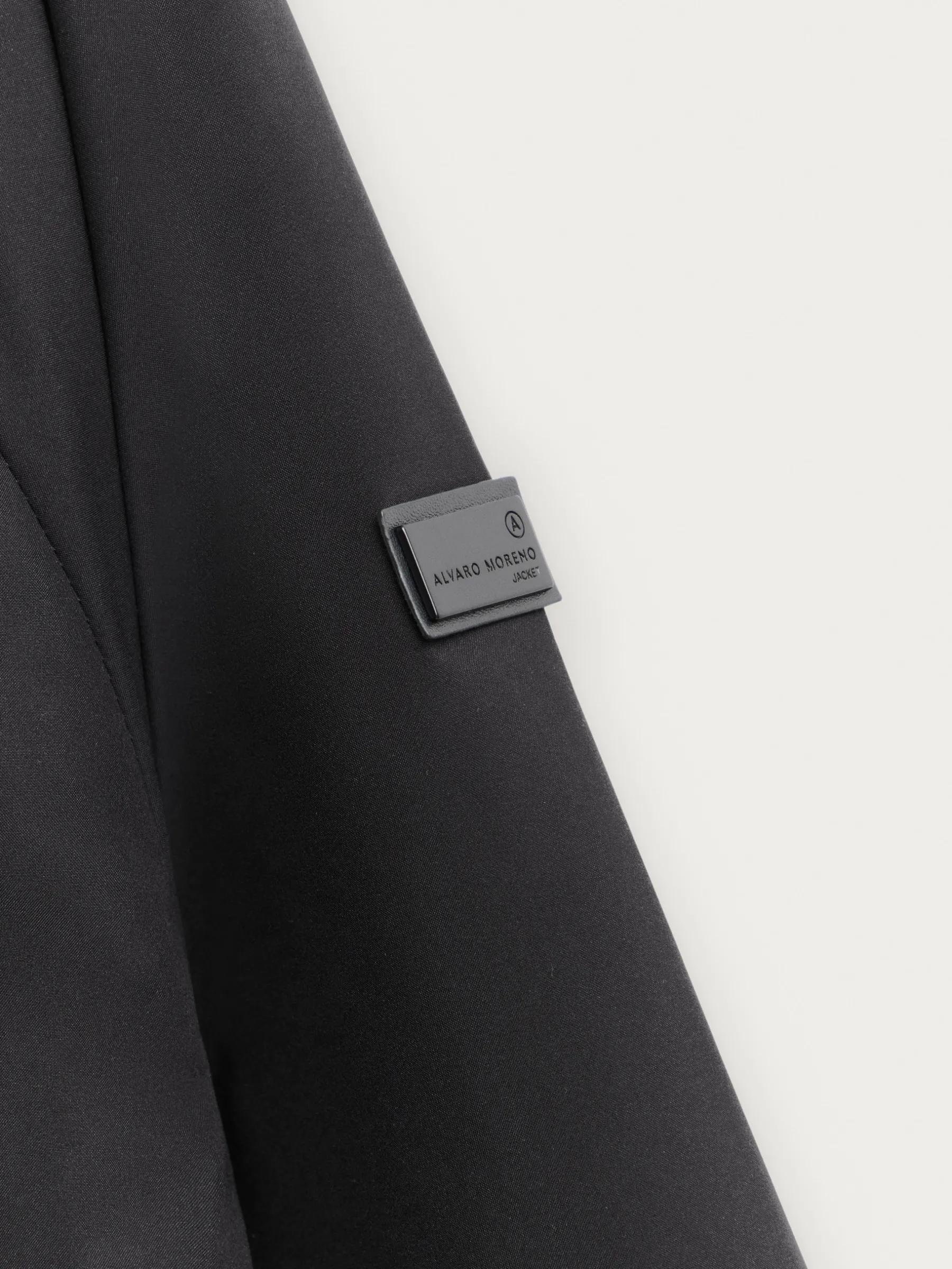 Cazadora acolchada con gorro ajustable. Cuenta con cierre central mediante doble cremallera oculta por tapeta de botones a presión, dos bolsillos en la cintura con cierre de cremallera y puños con terminación elástica. Parche personalizado en una de sus mangas. Bolsillo interior.