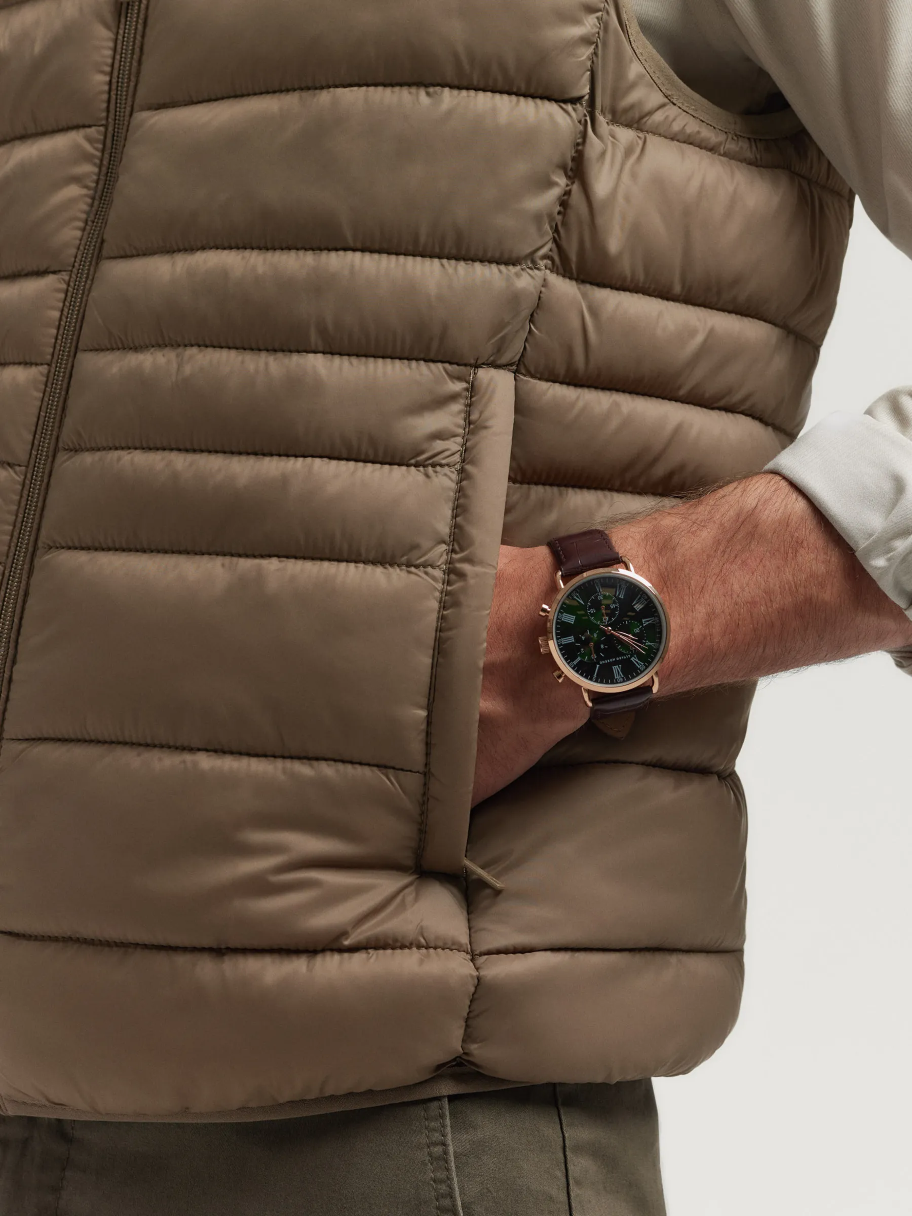 Chaleco acolchado con cuello subido. Dos bolsillo a la altura de la cintura, logo grabado en el frontal y sisa y cintura en punto elástico. Forro interior a contraste con bolsillos.
