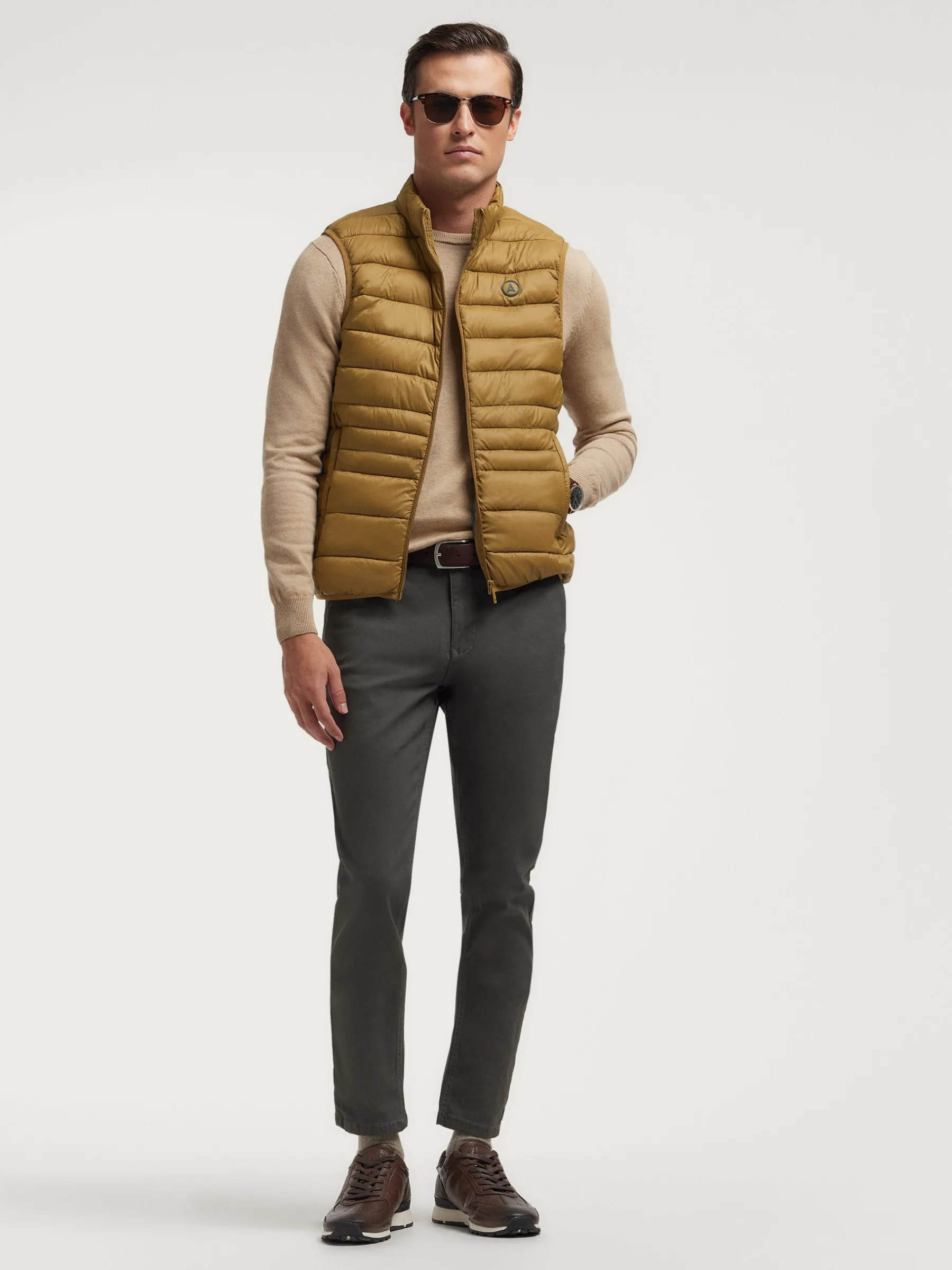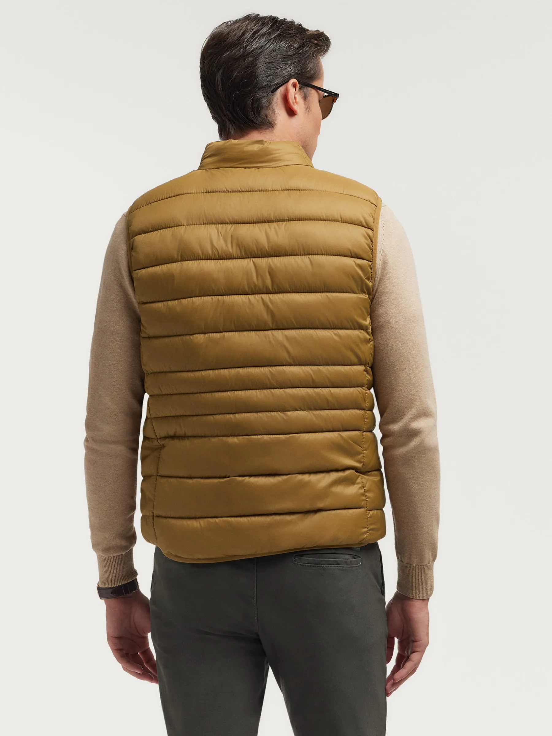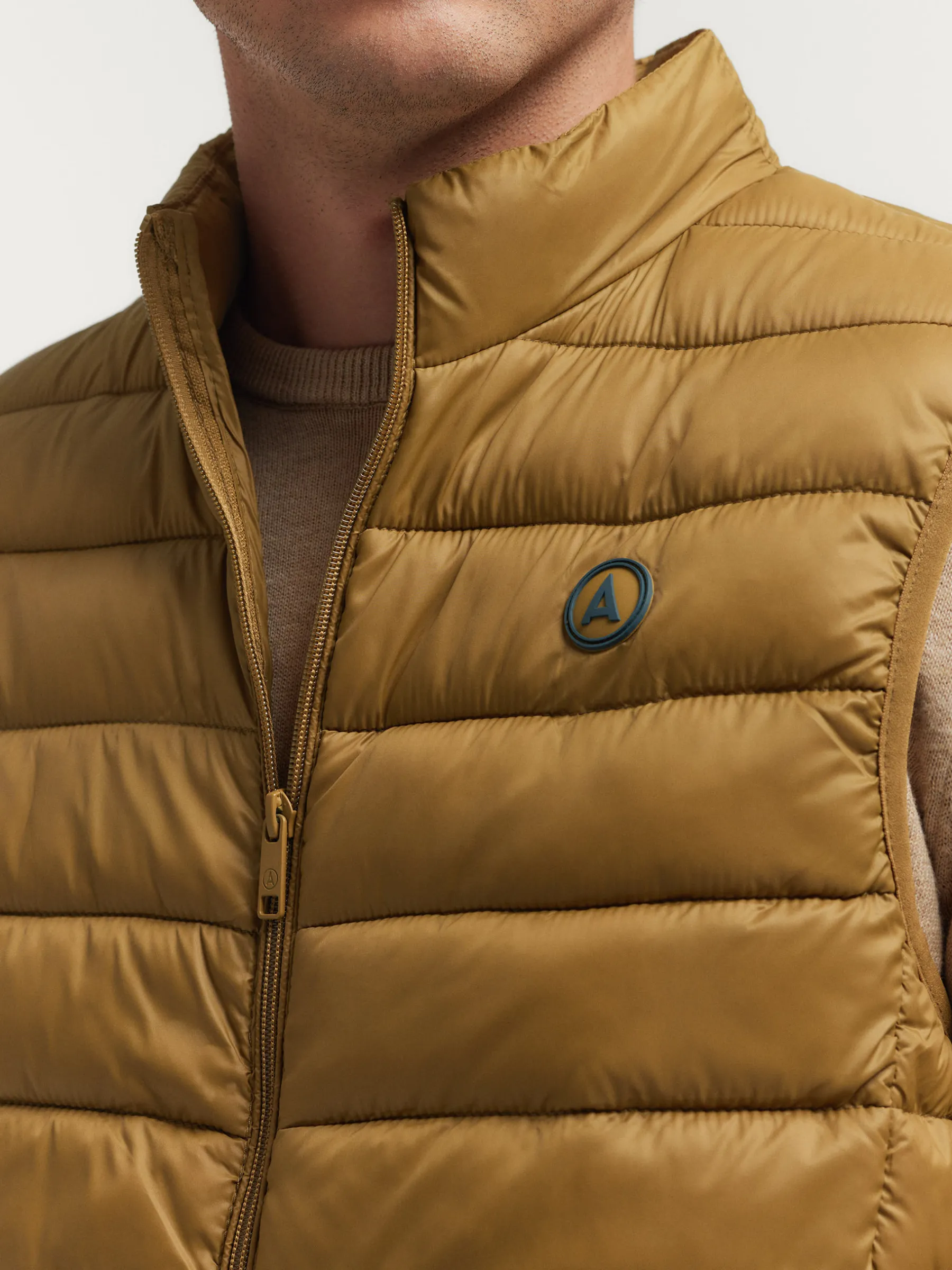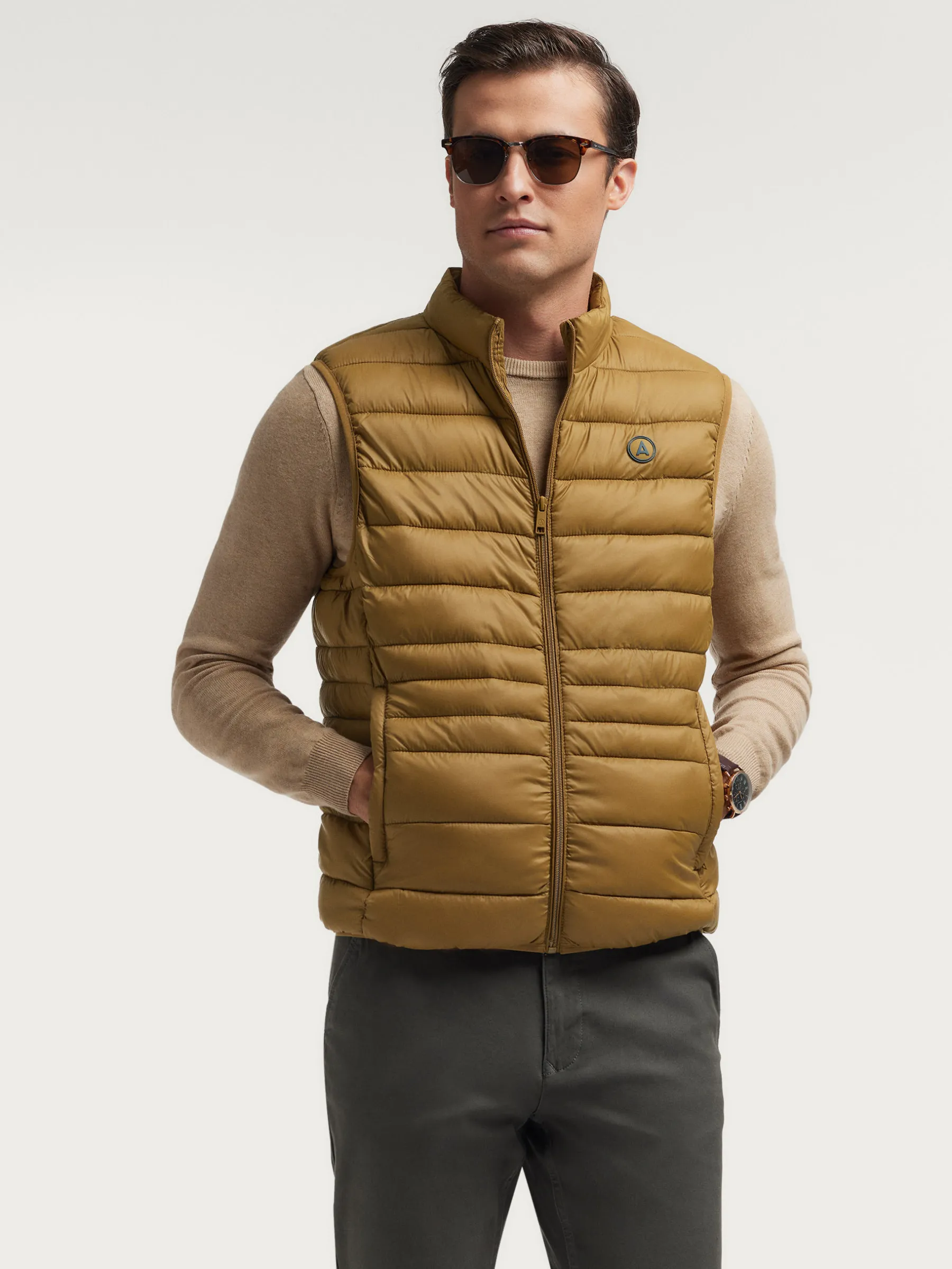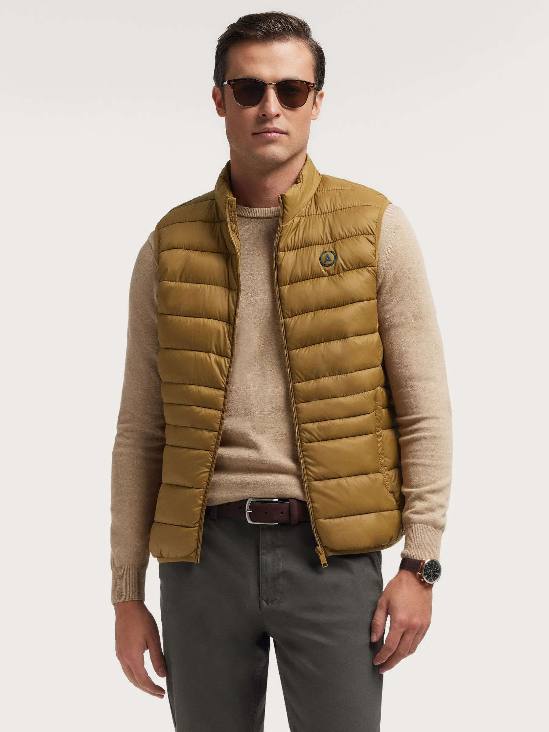 Chaleco acolchado con cuello subido. Dos bolsillo a la altura de la cintura, logo grabado en el frontal y sisa y cintura en punto elástico. Forro interior a contraste con bolsillos.