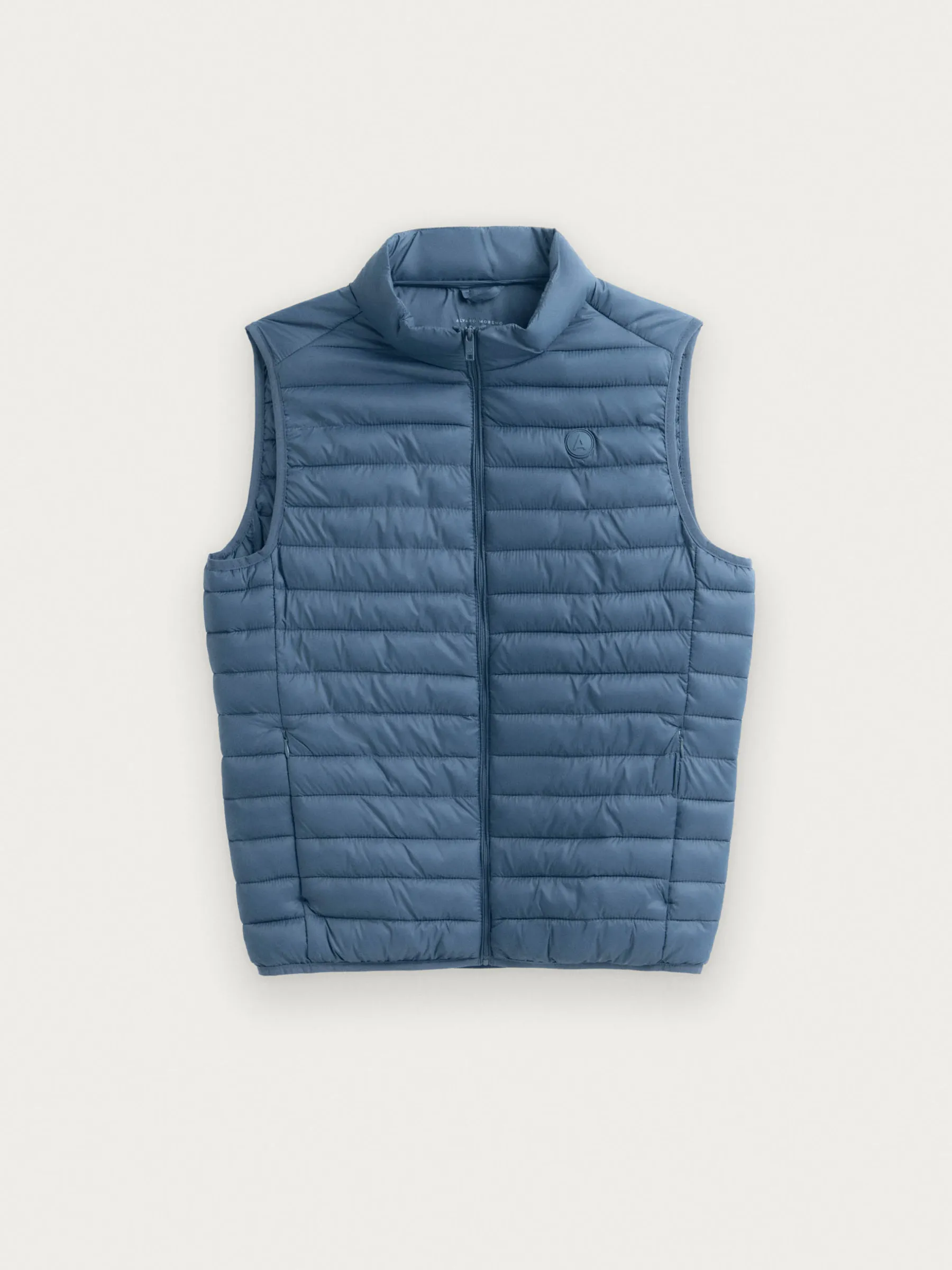 Chaleco acolchado con cuello subido y cierre central mediante cremallera, dos bolsillos a la altura de la cintura y logo de la marca grabado en el pecho. Elástico en la sisa y cintura. Forro interior a contraste con bolsillos.