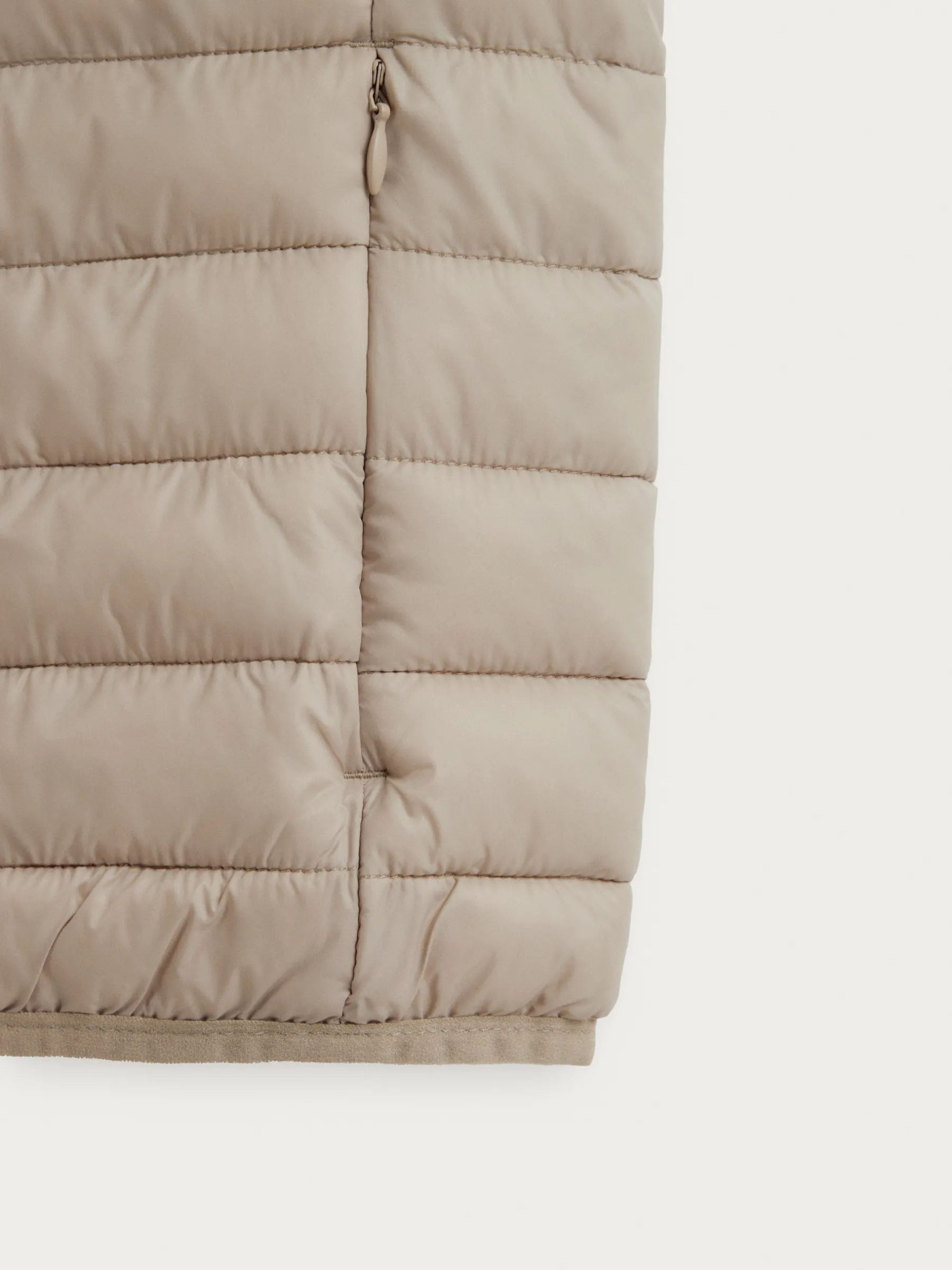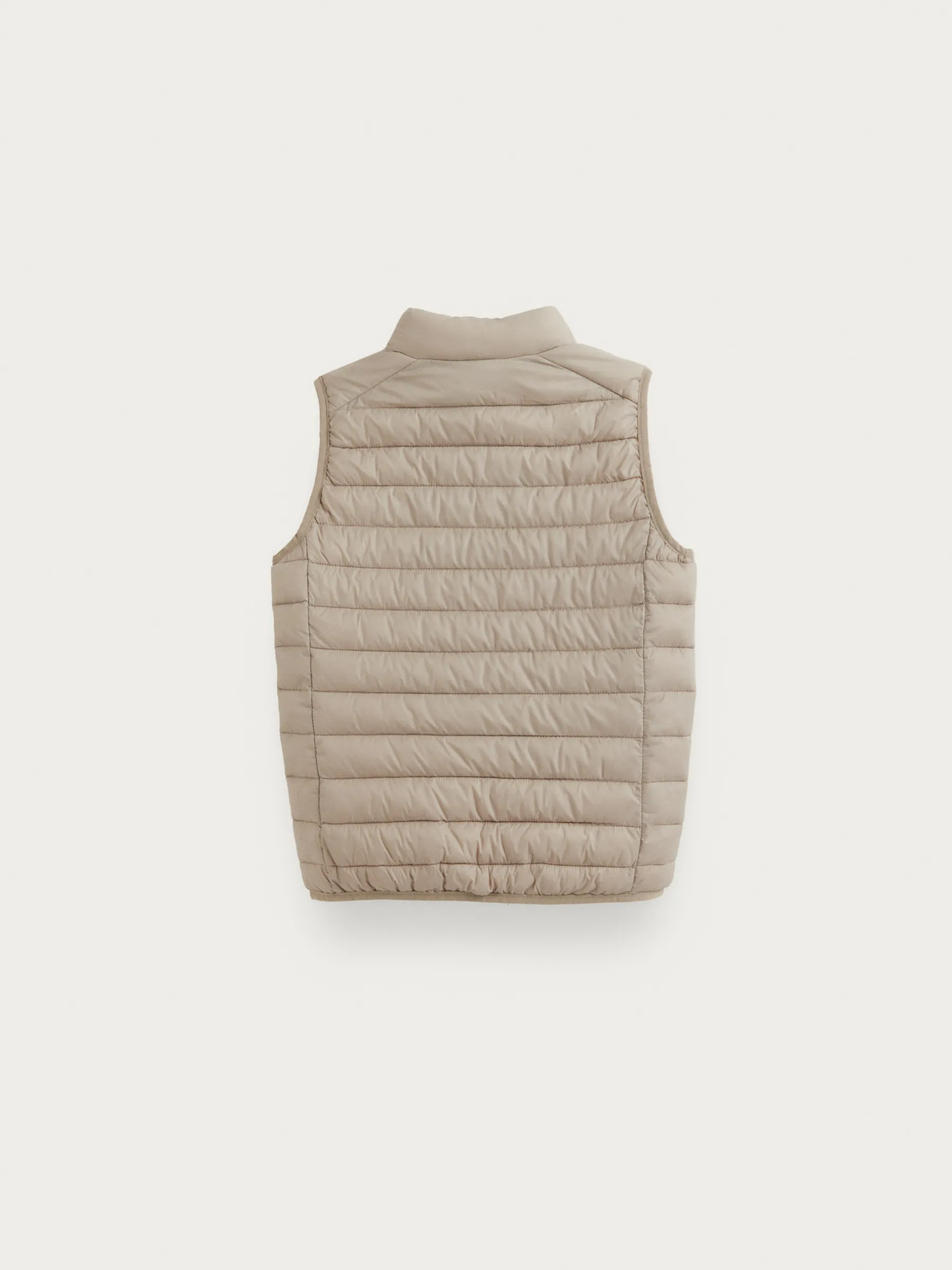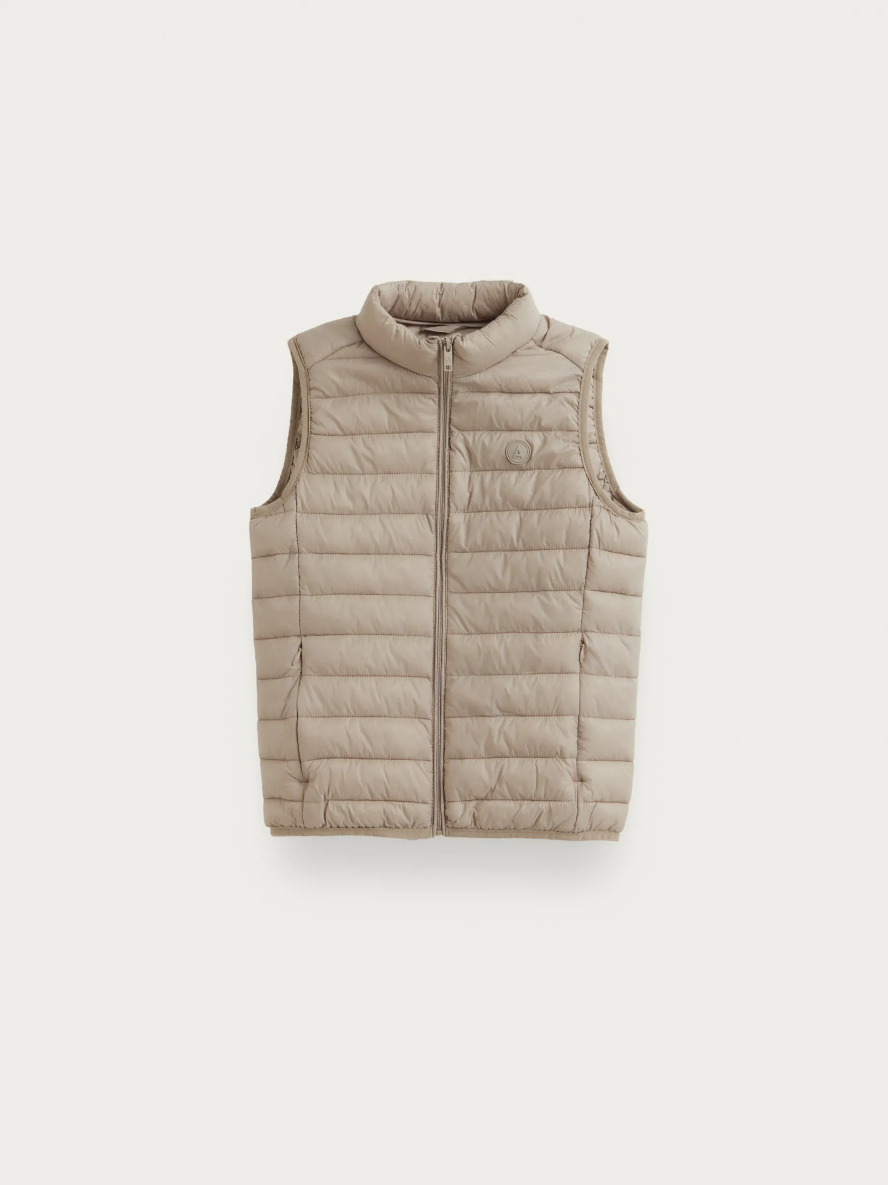 Chaleco acolchado con cuello subido y cierre central mediante cremallera, dos bolsillos a la altura de la cintura y logo de la marca grabado en el pecho. Elástico en la sisa y cintura. Forro interior a contraste con bolsillos.