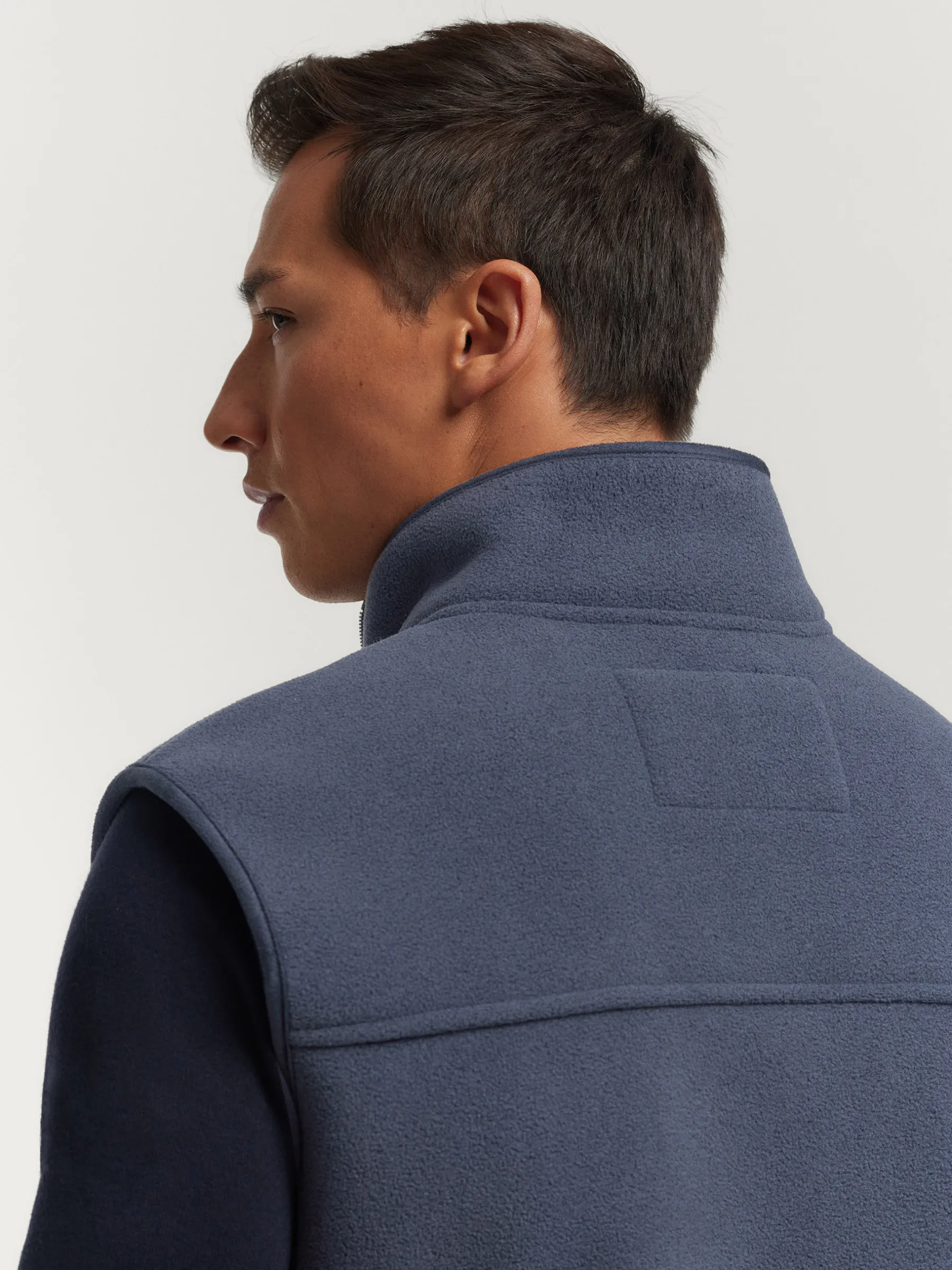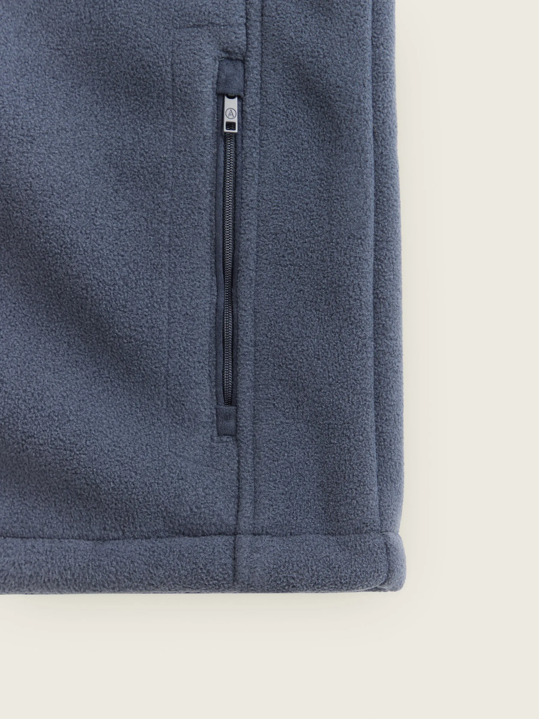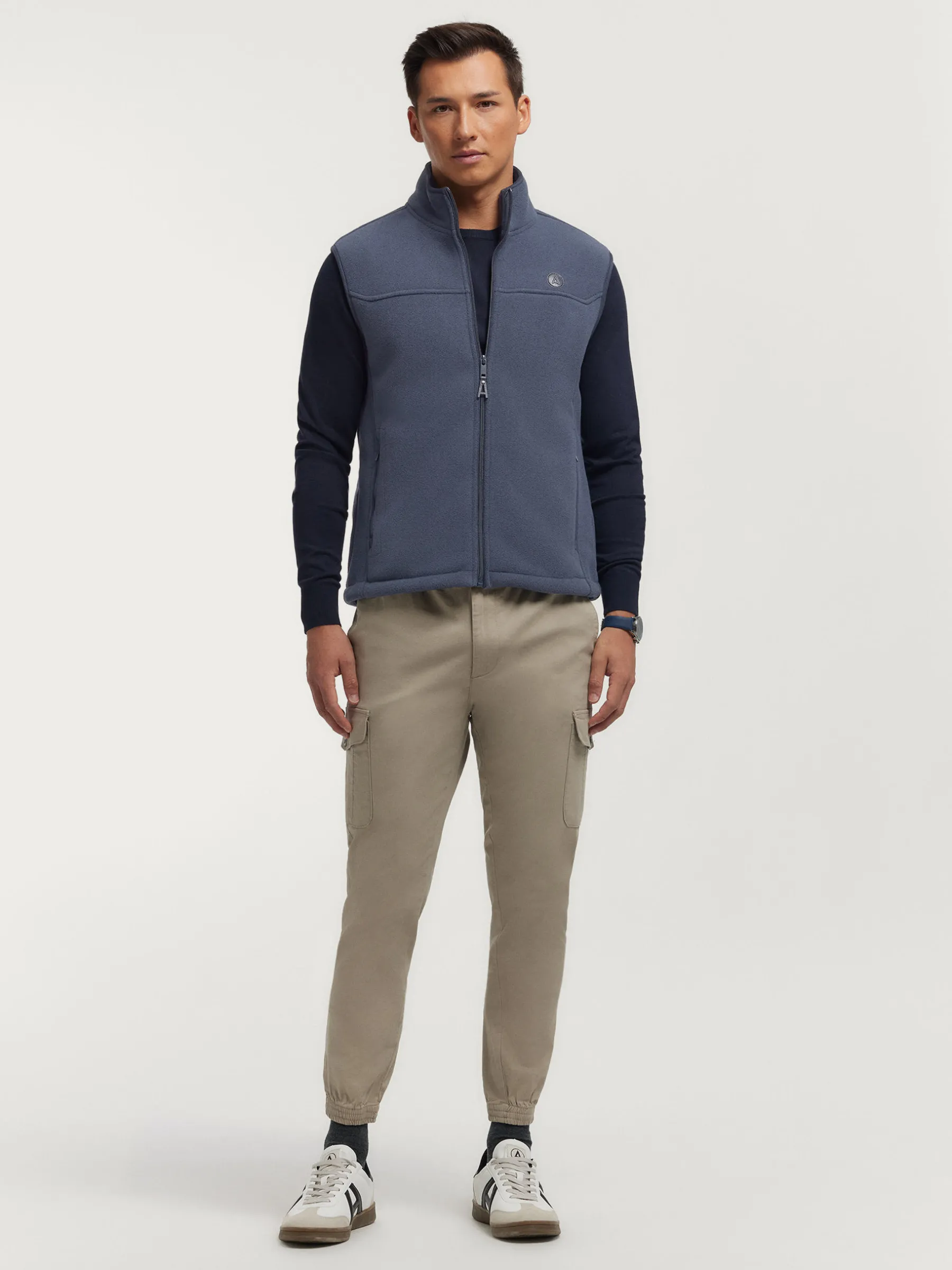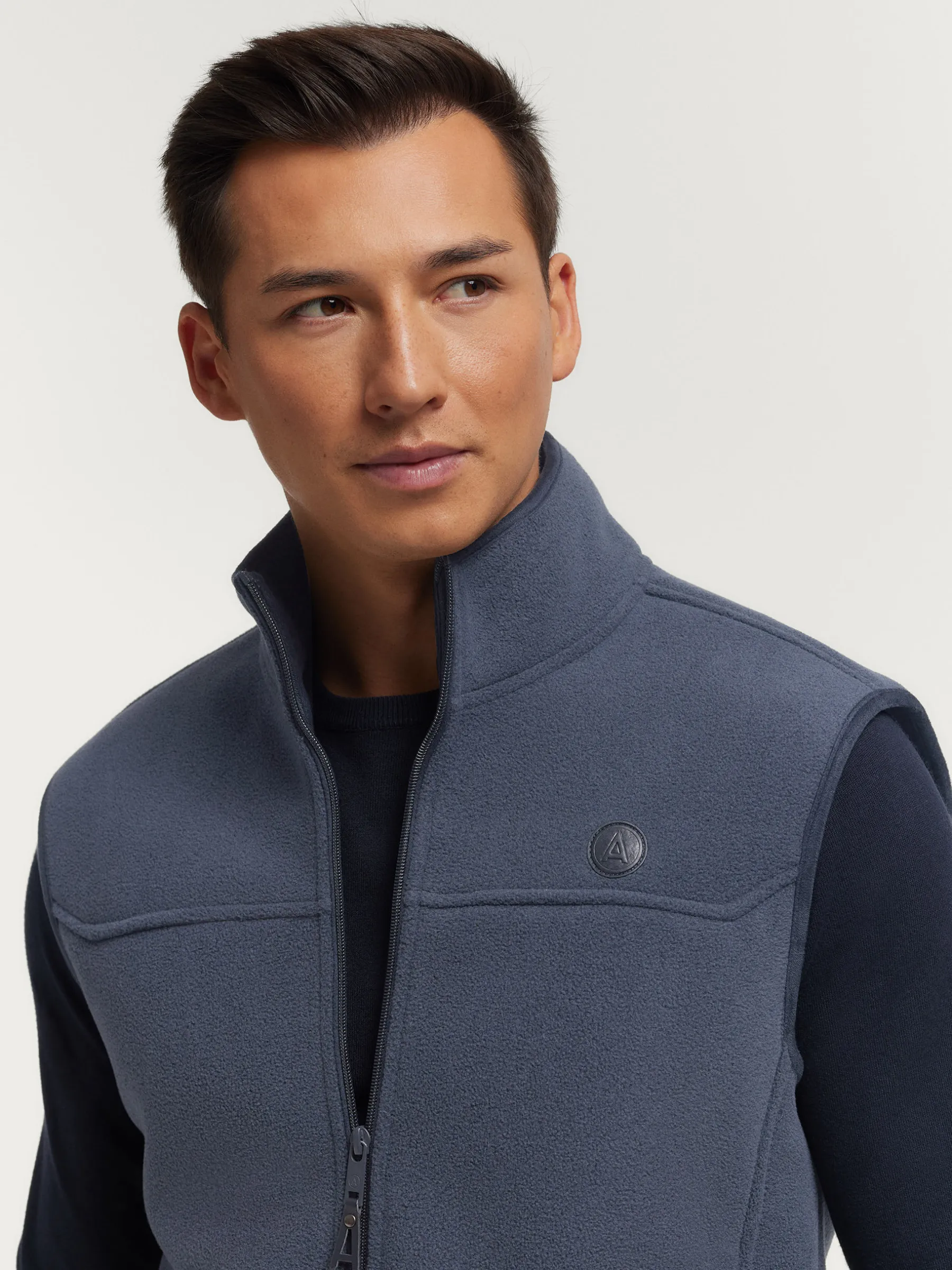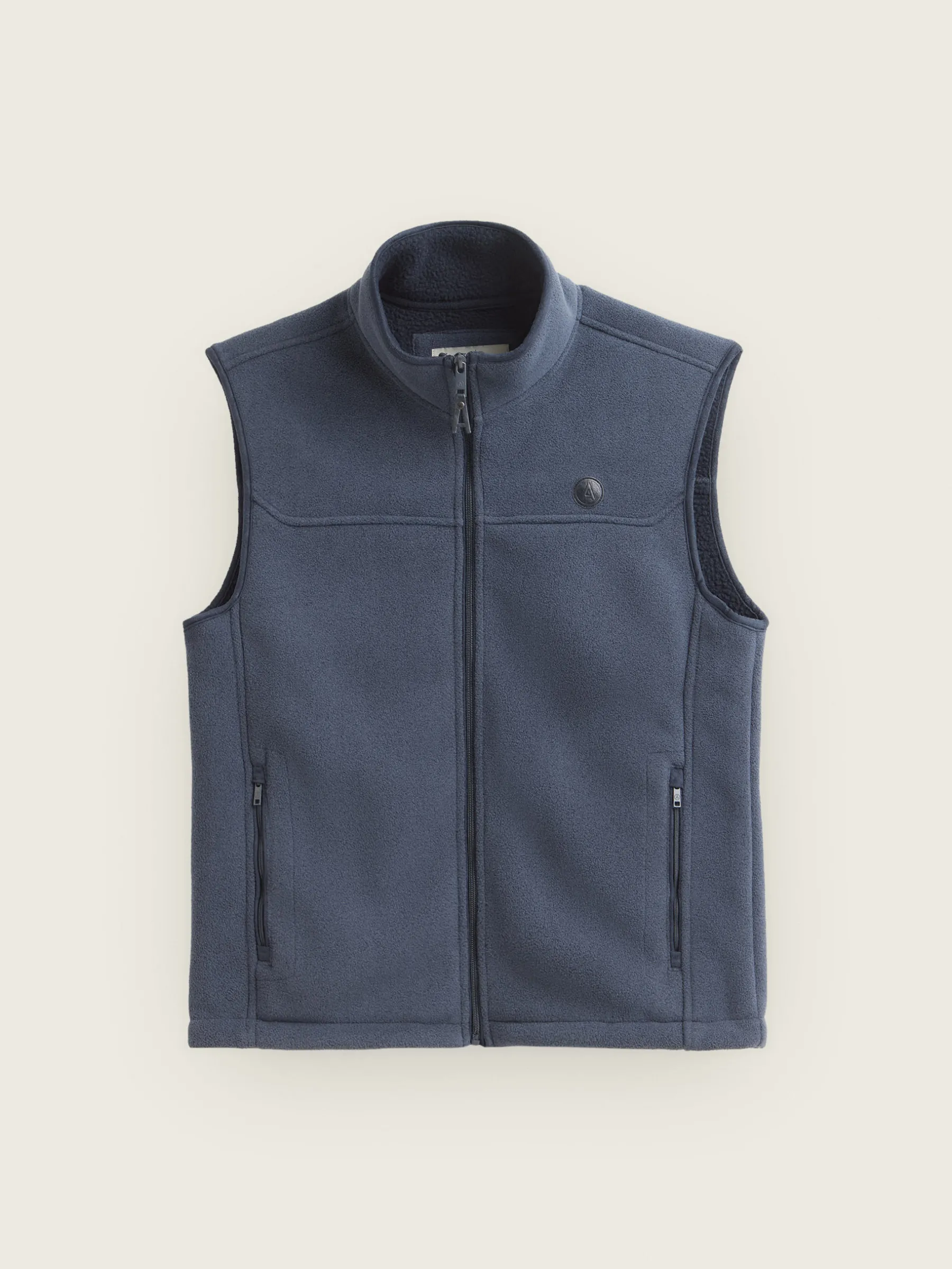 Chaleco confeccionado en tejido avivado en antelina en su exterior y forrado en su interior en borreguillo. Cuenta con cierre central mediante cremallera personalizada, dos bolsillos en su exterior y logo grabado en su frontal. Corte regular fit.