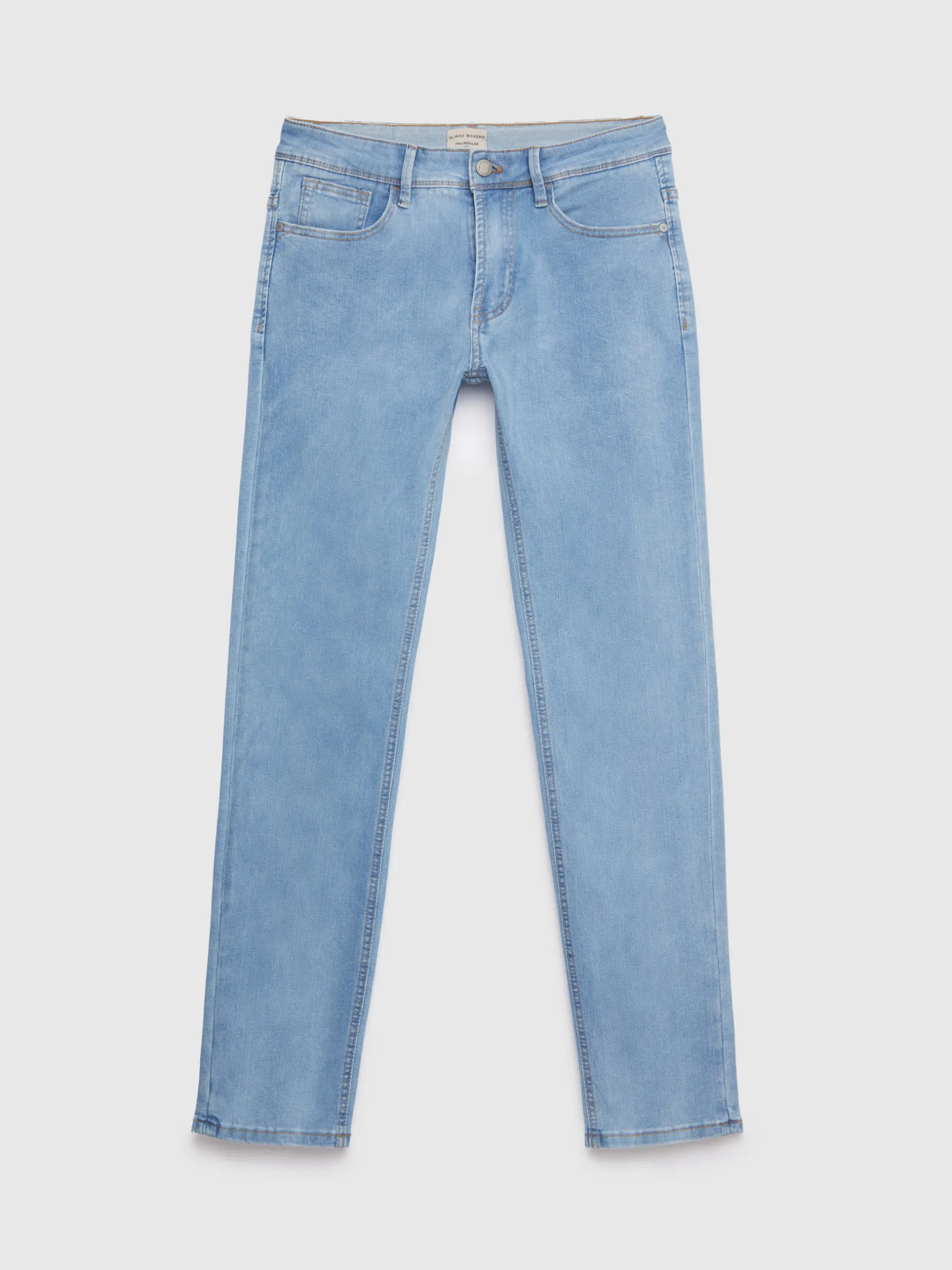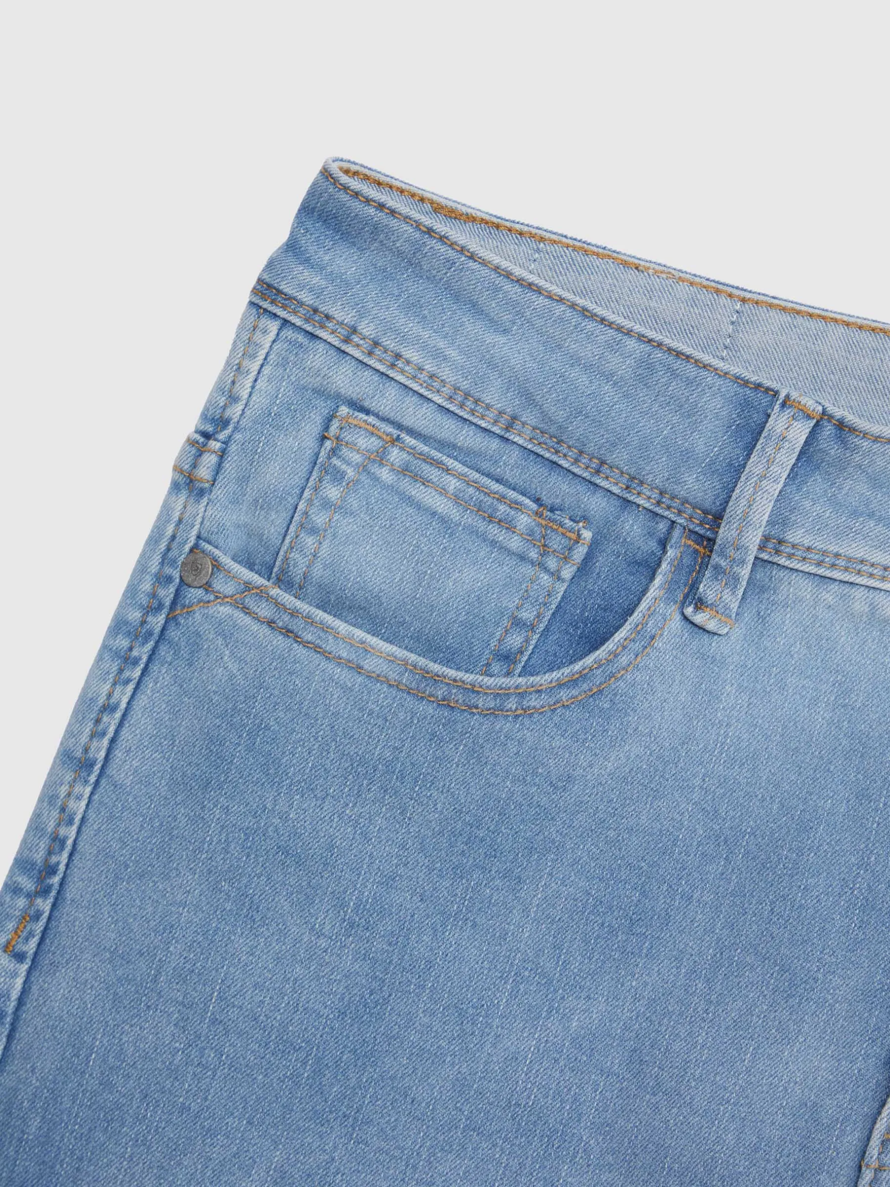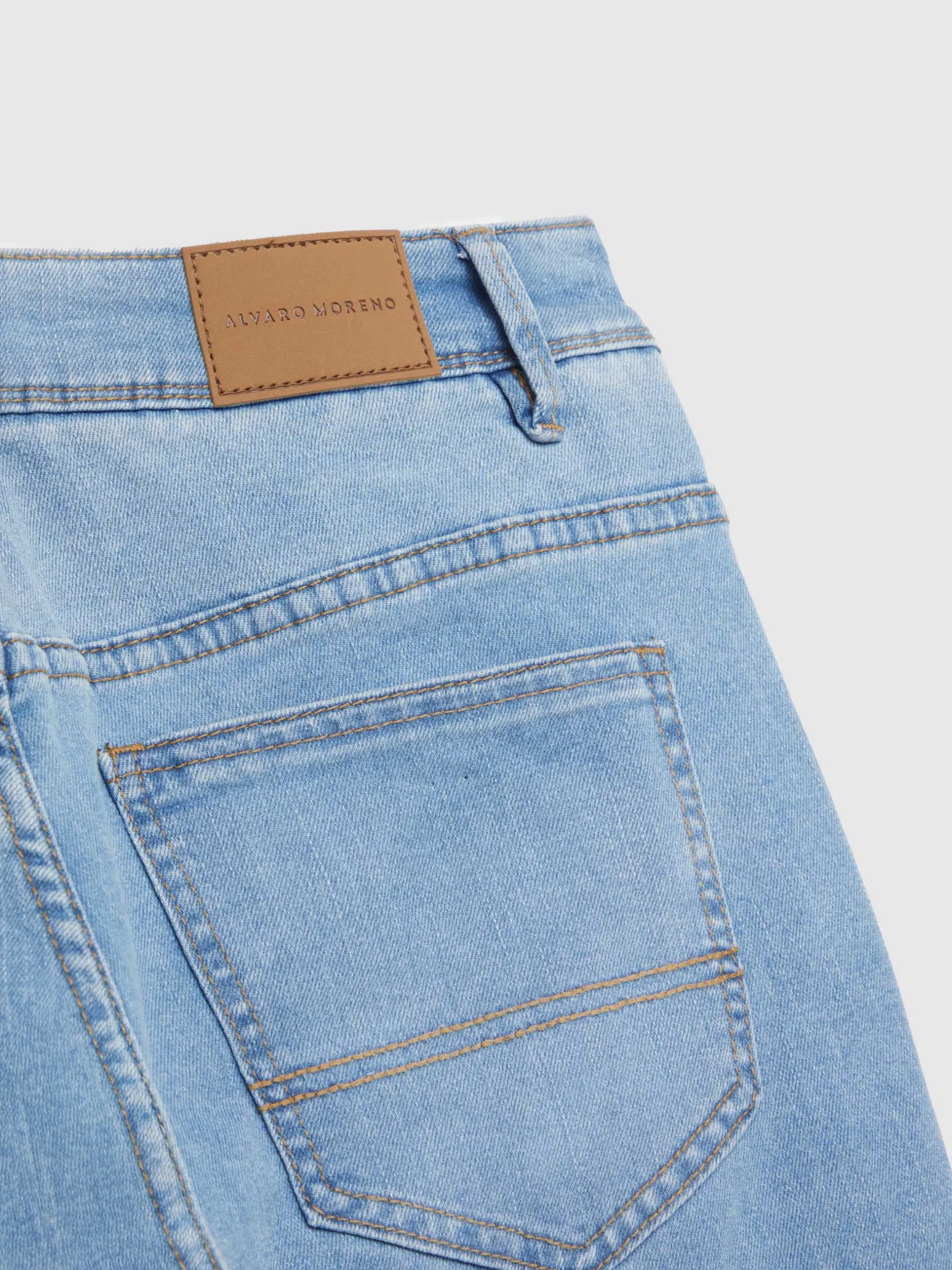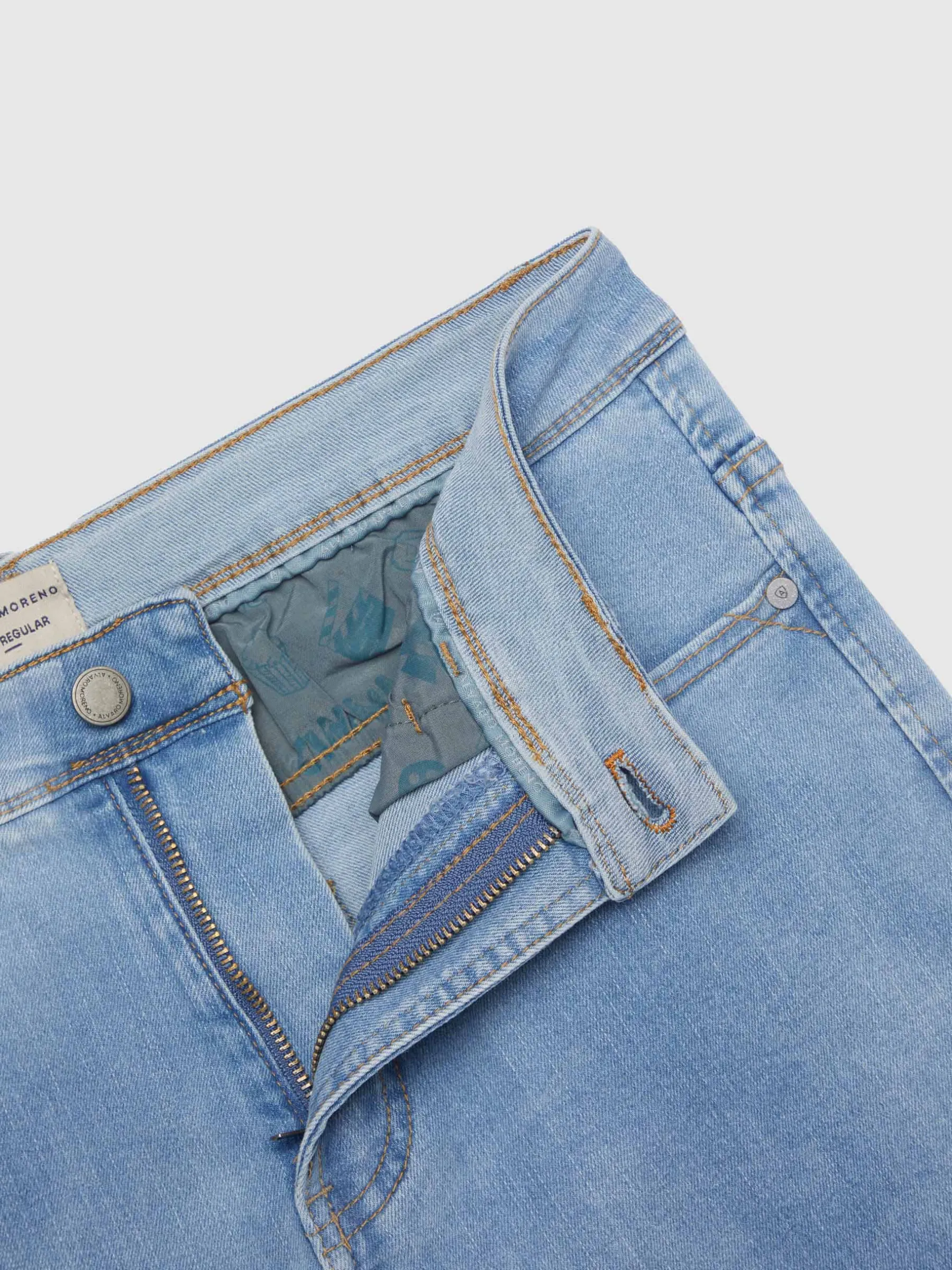 Pantalón denim de corte regular fit con cinco bolsillos y cierre central mediante botón y cremallera, pespuntes en color camel, fornituras personalizadas y etiqueta en efecto piel en la cinturilla.