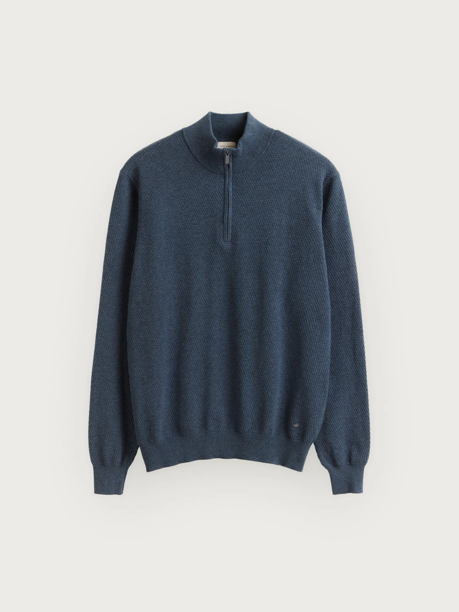 Jersey confeccionado en algodón con estructura en su tejido. Cuenta con cuello alto con medio cierre de cremallera y cuello, puños y bajo en acabado elástico. Corte regular fit.
