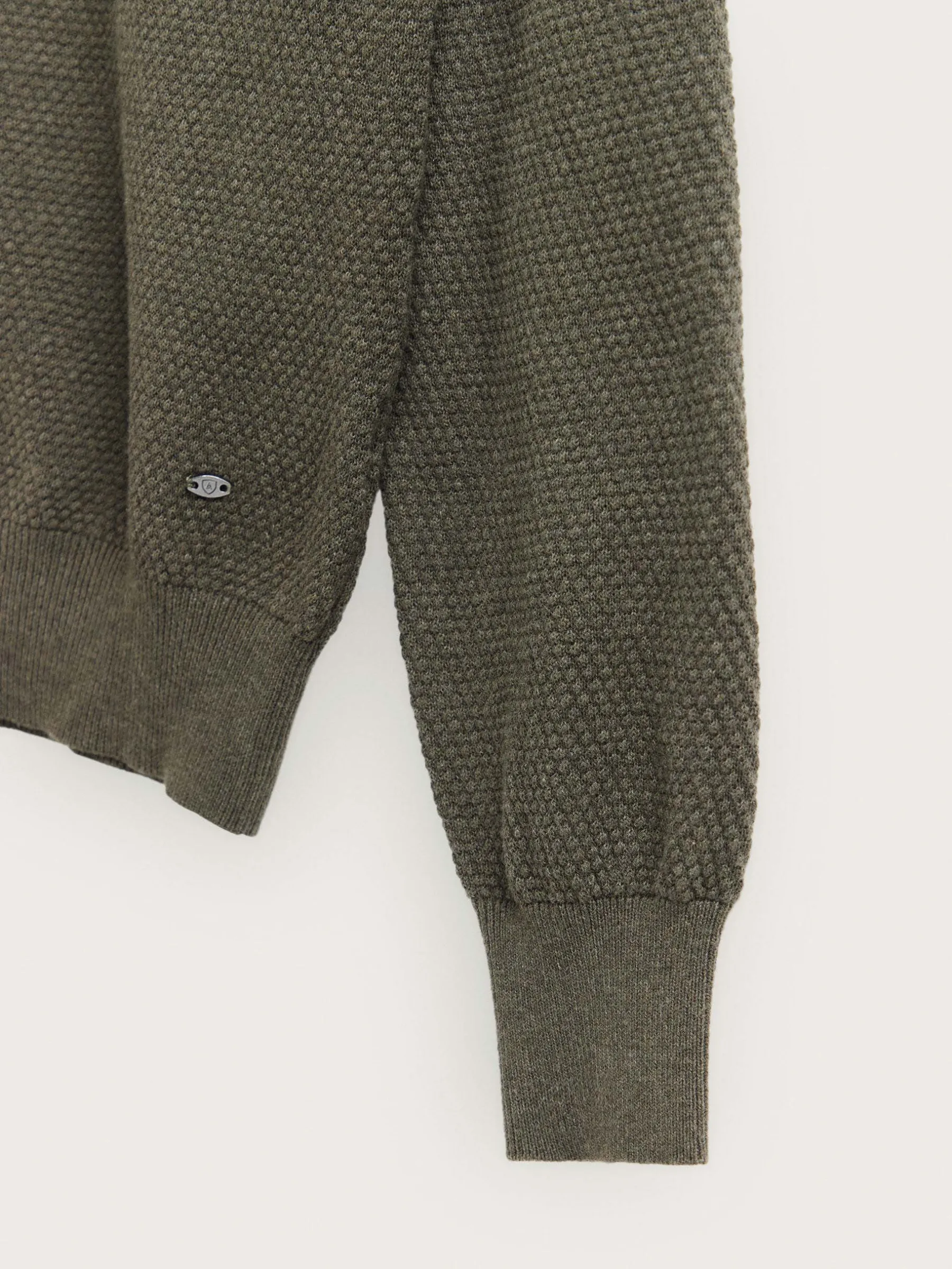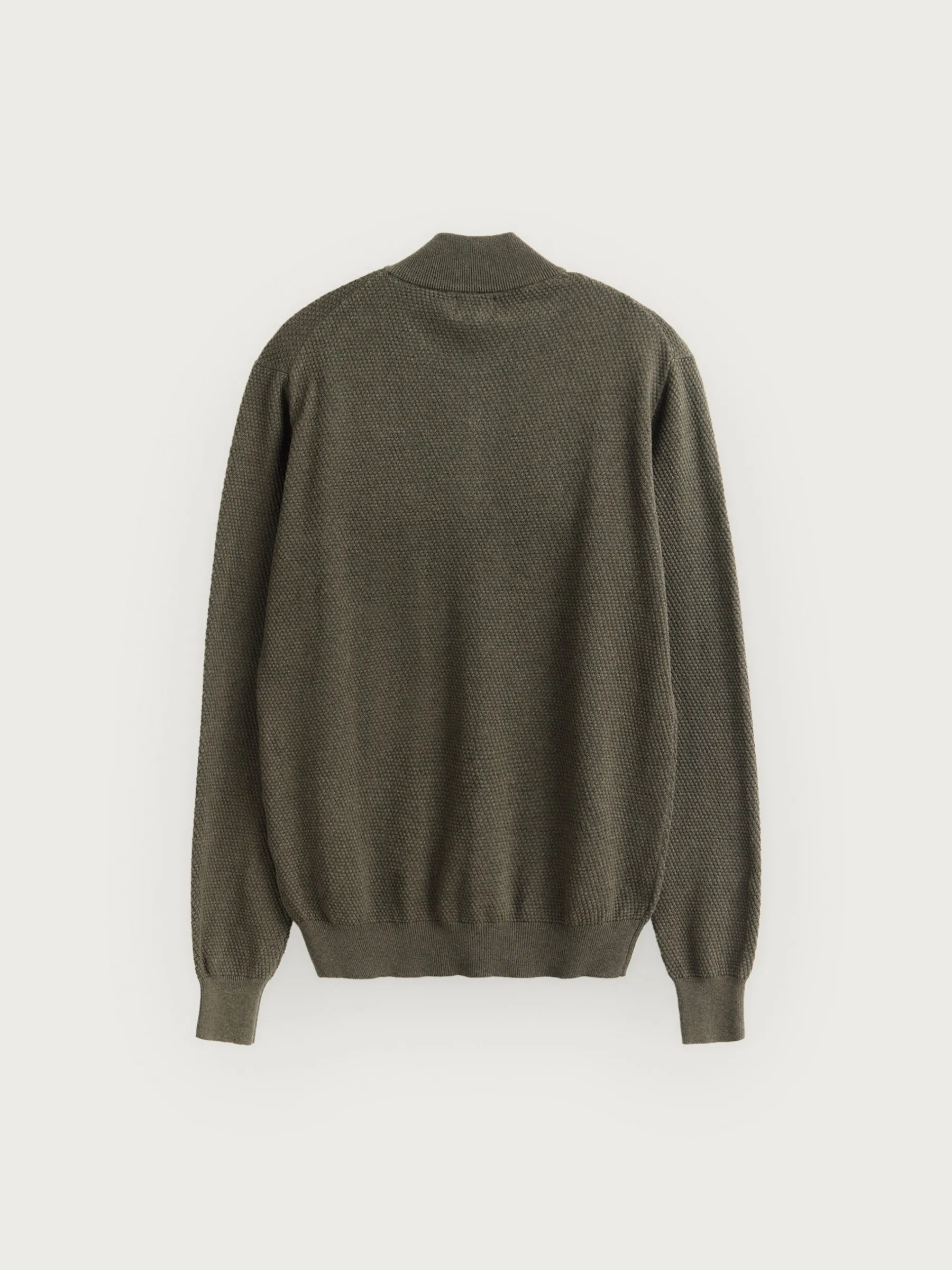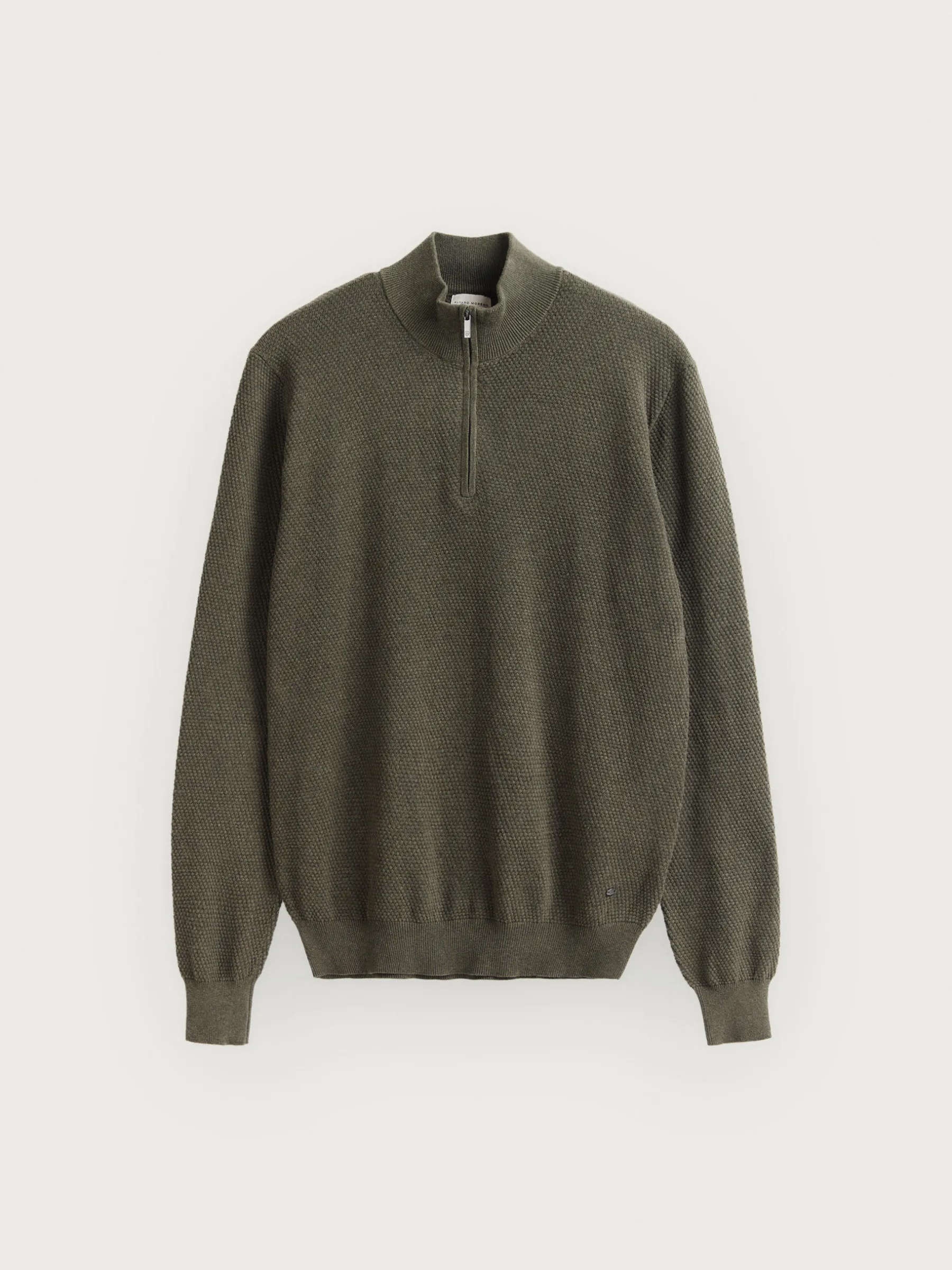 Jersey confeccionado en algodón con estructura en su tejido. Cuenta con cuello alto con medio cierre de cremallera y cuello, puños y bajo en acabado elástico. Corte regular fit.