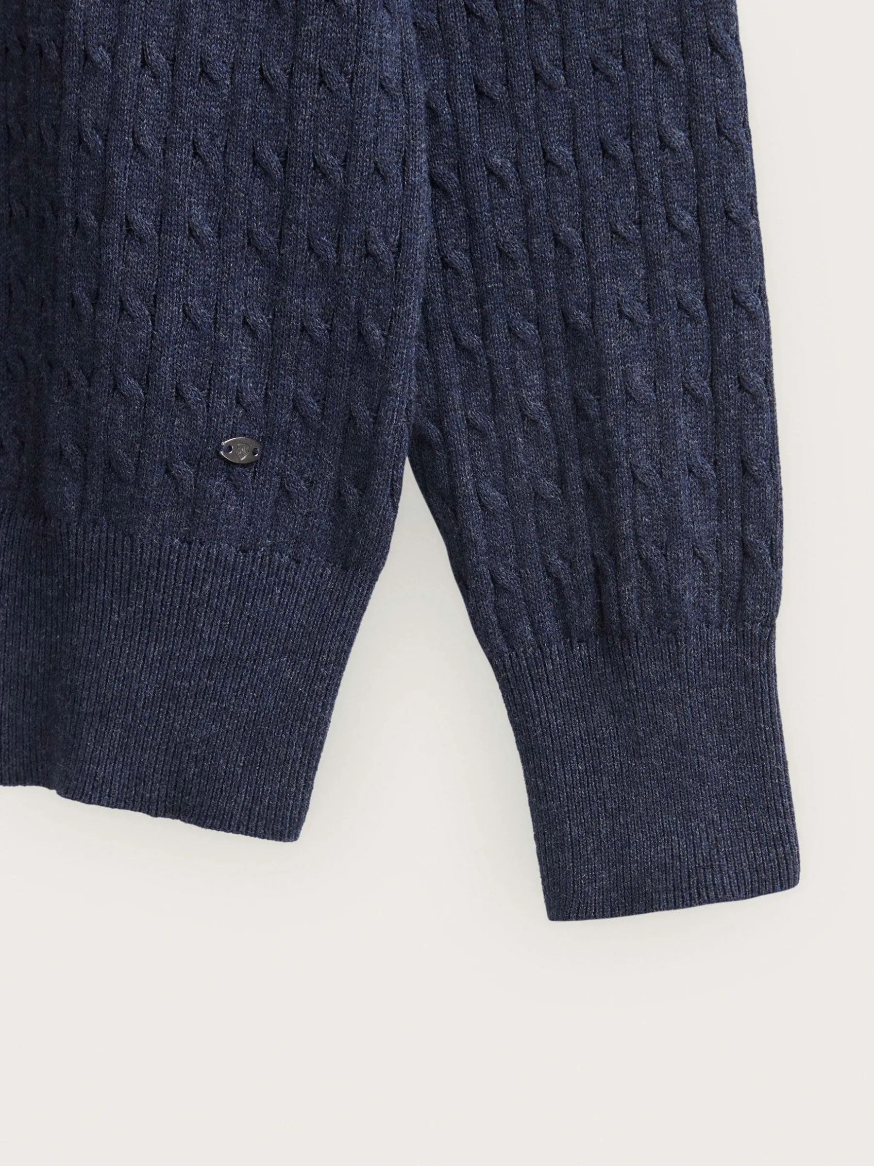 Jersey con estructura estilo ochos confeccionado en algodón. Cuenta con cuello redondo, manga larga y detalle metálico personalizado en el bajo. Cuello, puños y bajo en acabado ribeteado. Corte regular fit.