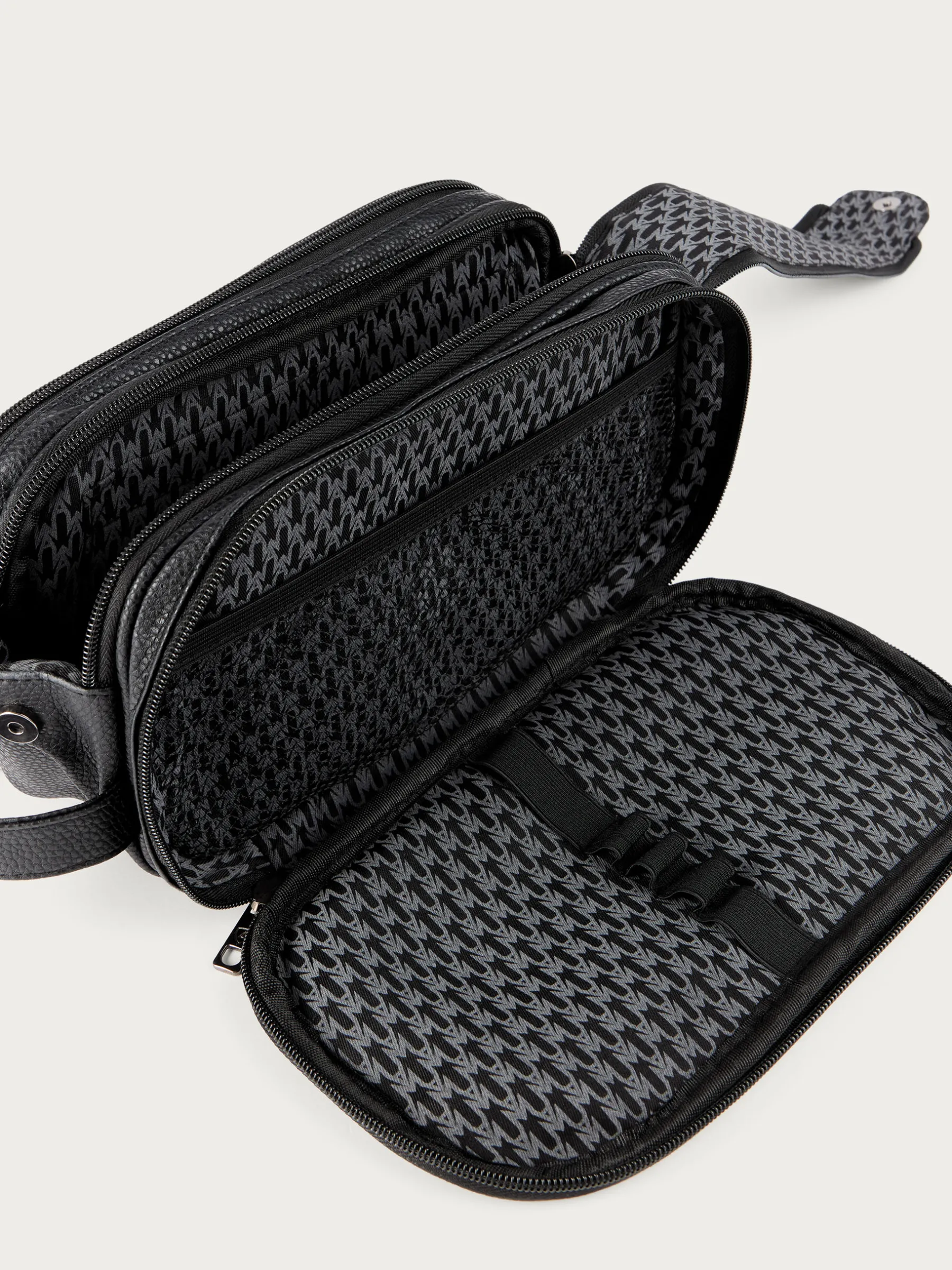 Neceser con asa de transporte lateral y detalle personalizado grabado en el frontal. Compartimento principal con cierre de doble cremallera y botón a presión. Compartimento en ambos laterales con cierre de cremallera. Forrado en su interior.