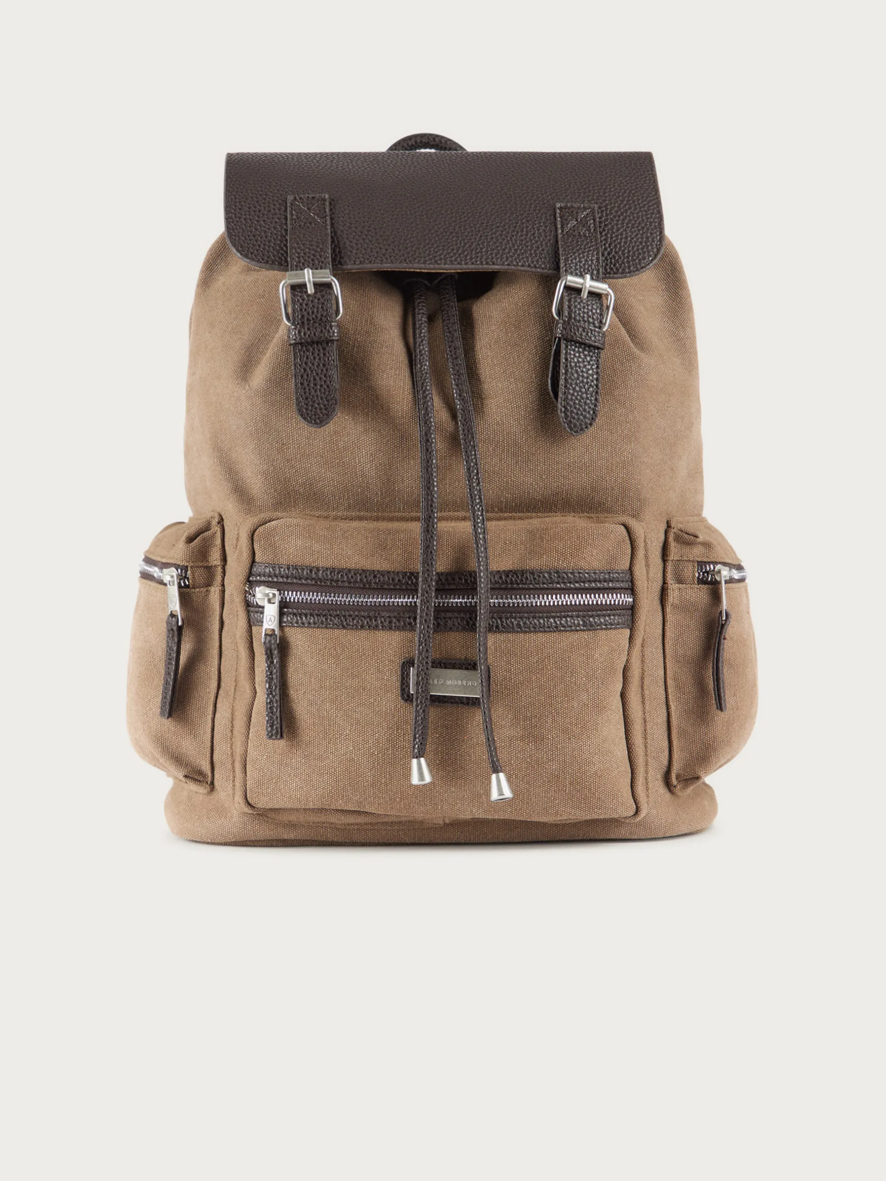 Mochila estilo explorer con dos asas de hombro ajustables, gran compartimento principal con cierre mediante solapa y diferentes bolsillos en su interior. Cordón ajustable. Bolsillo en el frontal y en ambos laterales con cierre mediante cremallera. Forrado en su interior.