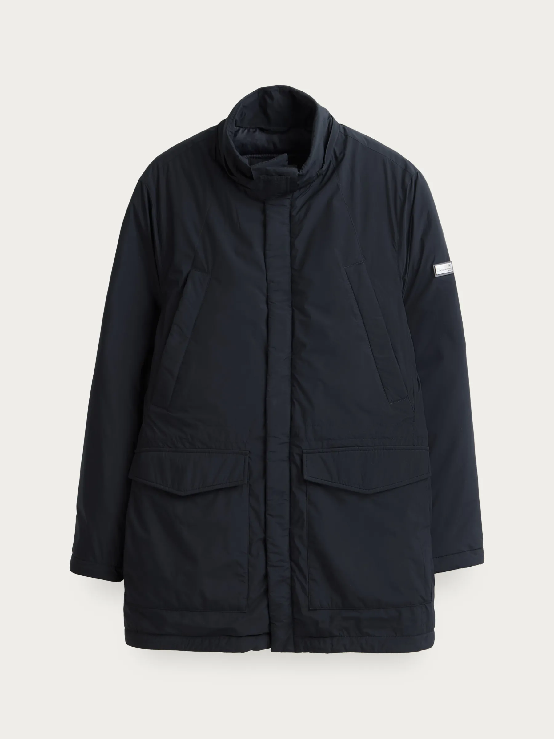 Parka acolchada con gorro desmontable. Cuenta con cierre central mediante doble cremallera oculta por tapeta de botones a presión. Dos bolsillos a altura del pecho, dos en la cintura y uno inteior. Detalle personalizado en una de sus mangas. Corte regular fit.