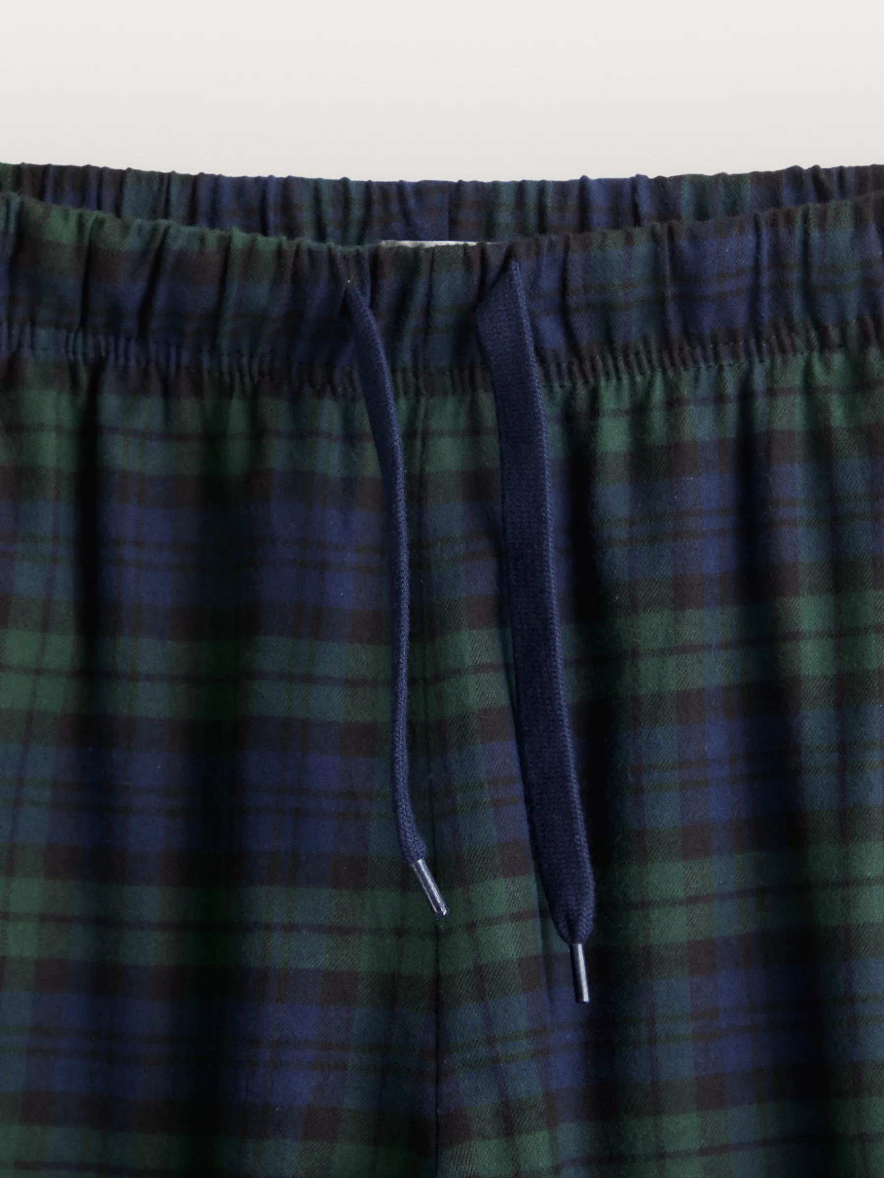 Pijama compuesto por dos piezas, superior e inferior. Parte superior camiseta de manga larga con cierre mediante tres botones en el cuello. Pantalón a cuadros con cinturilla elástica y cordón ajustable.